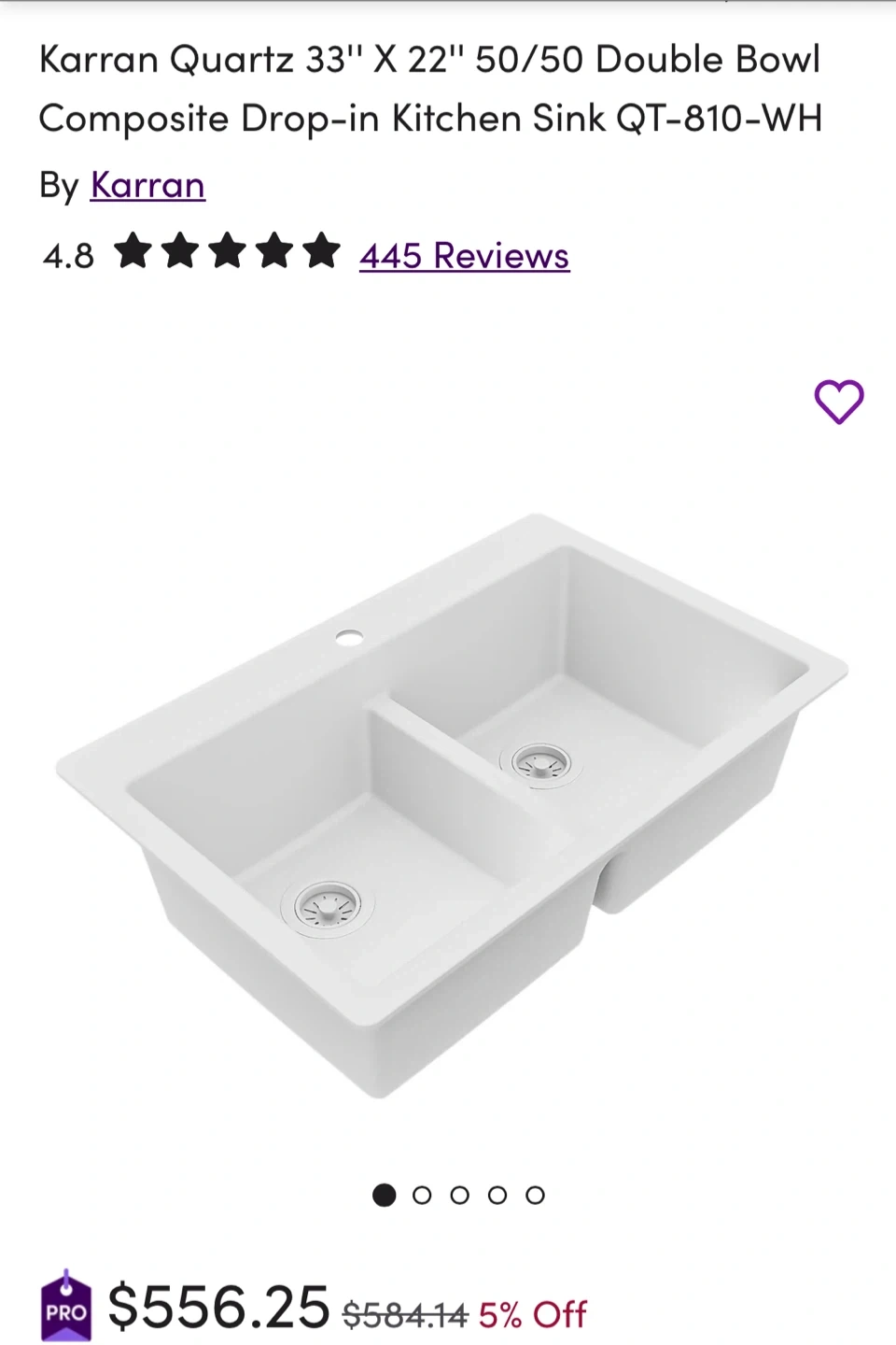 10Selling a Karran Quartz composite drop-in kitchen sink! It's a double bowl, 50/50 split, and measures 33" x 22". This model is the QT-810-WH. Originally bought for $556.25. It is already uninstalled and in storage. Nothing wrong with it just a bit dusty and have some cocking at the top but can be easily cleaned before installing