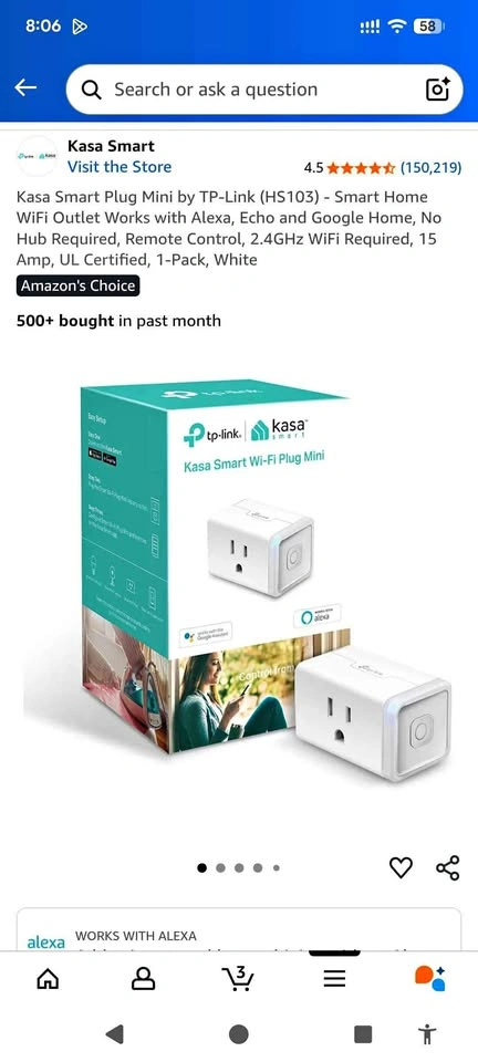 Kasa Matter Smart Plug w/ Energy Monitoring, Compact Design, 15A/1800W Max, Super Easy Setup, Works with Apple Home, Alexa & Google Home, UL Certified, 2.4G Wi-Fi Only, White, KP125M (2-Pack). Bought it from Amazon. You will get 1 working plug.