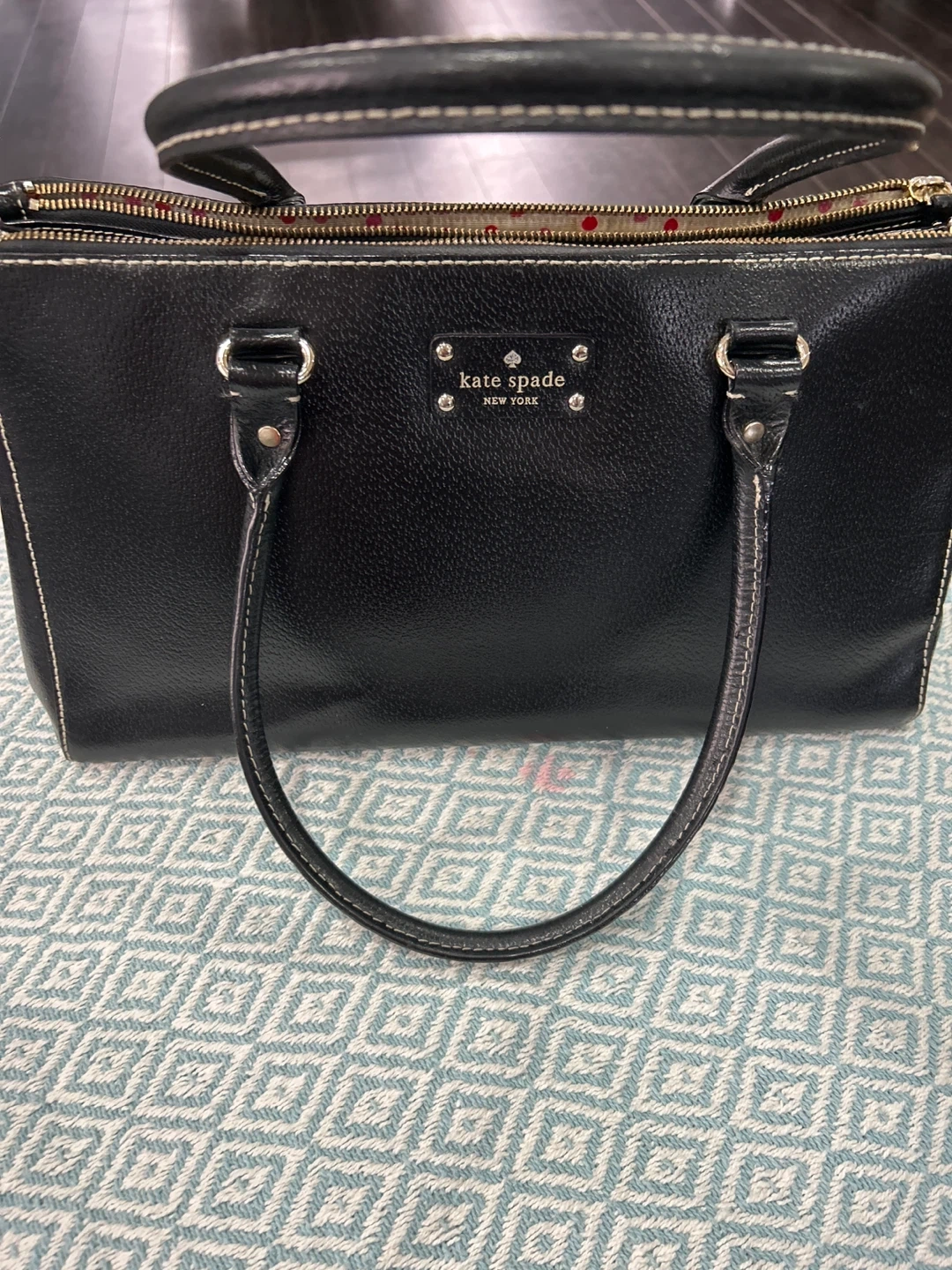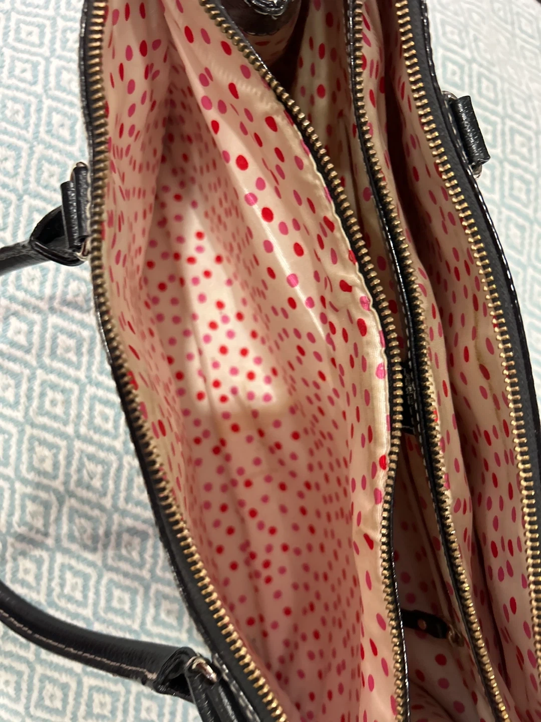 23Selling a Kate Spade satchel in black leather. It's in great shape and features a fun polka dot lining. Perfect for everyday use!
