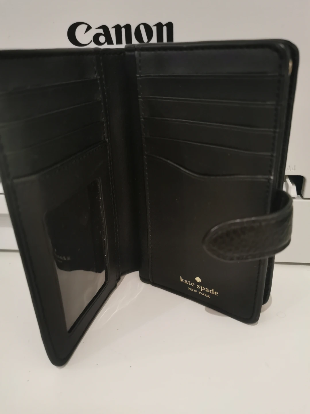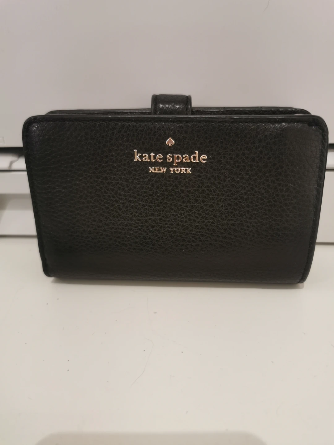 26I'm selling a Kate Spade wallet in black leather. It's in great condition and has a convenient, compact design. Perfect for everyday use!