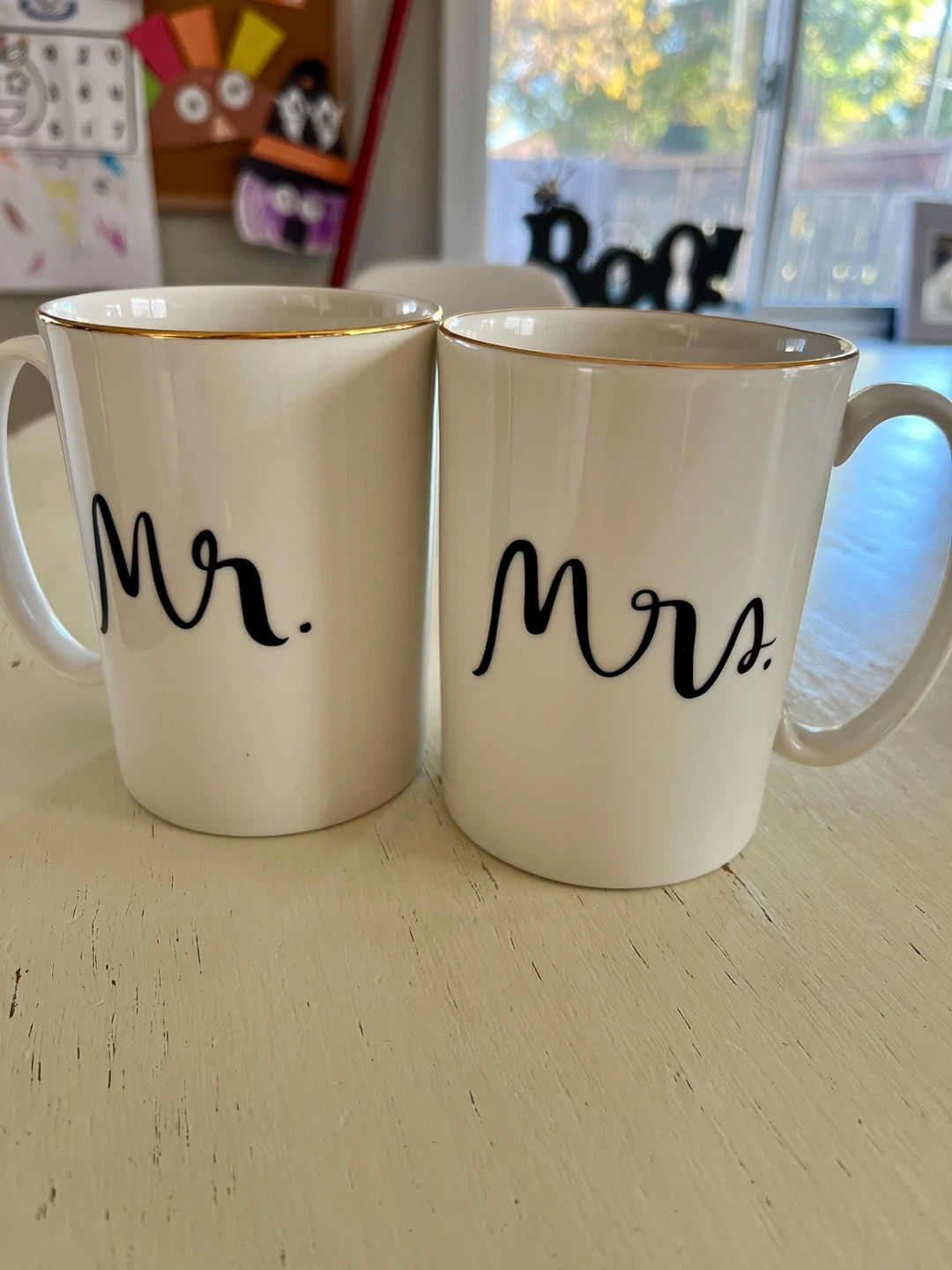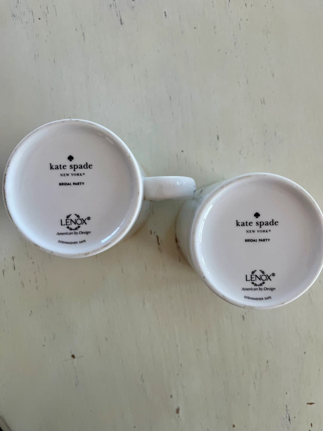 10Selling a set of Kate Spade New York 'Bridal Party' mugs! These are from the Lenox American by Design collection. They're white with gold trim and say 'Mr.' and 'Mrs.' in black lettering. Dishwasher safe. No chips!