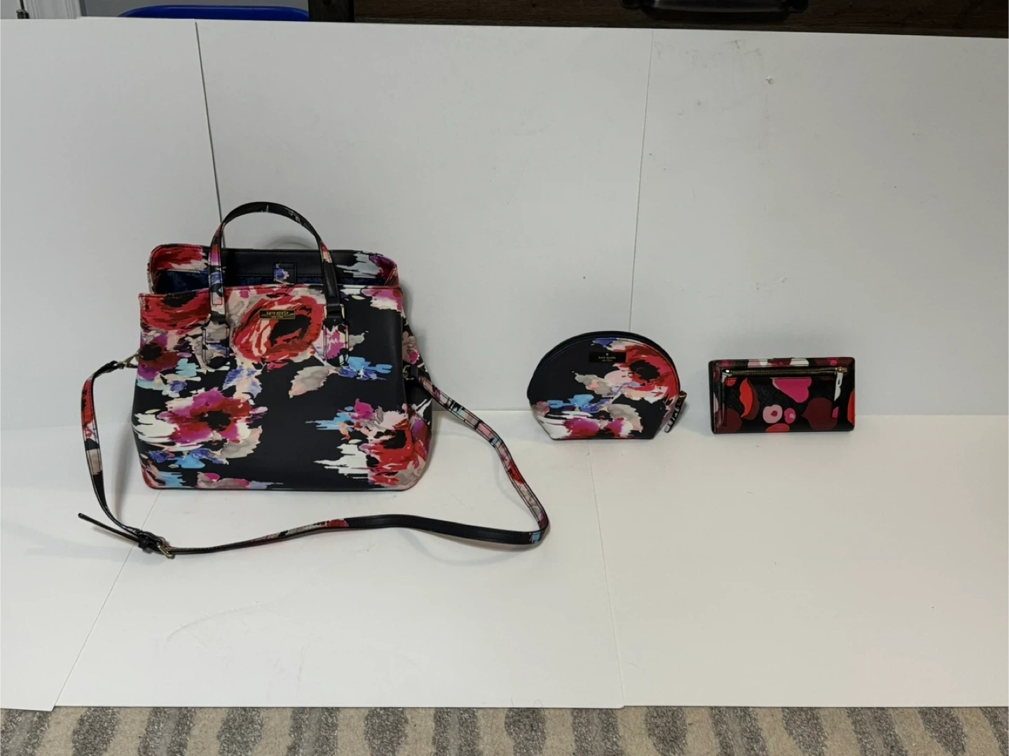 65Selling a Kate Spade handbag with a floral design, along with a matching cosmetic bag and wallet! The handbag features a shoulder strap and is perfect for everyday use. The cosmetic bag is great for keeping your makeup organized, and the wallet is compact and stylish. All three items have a beautiful floral pattern that adds a touch of elegance.