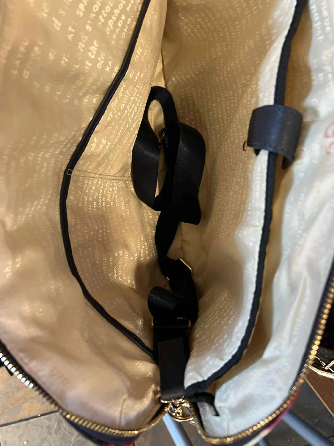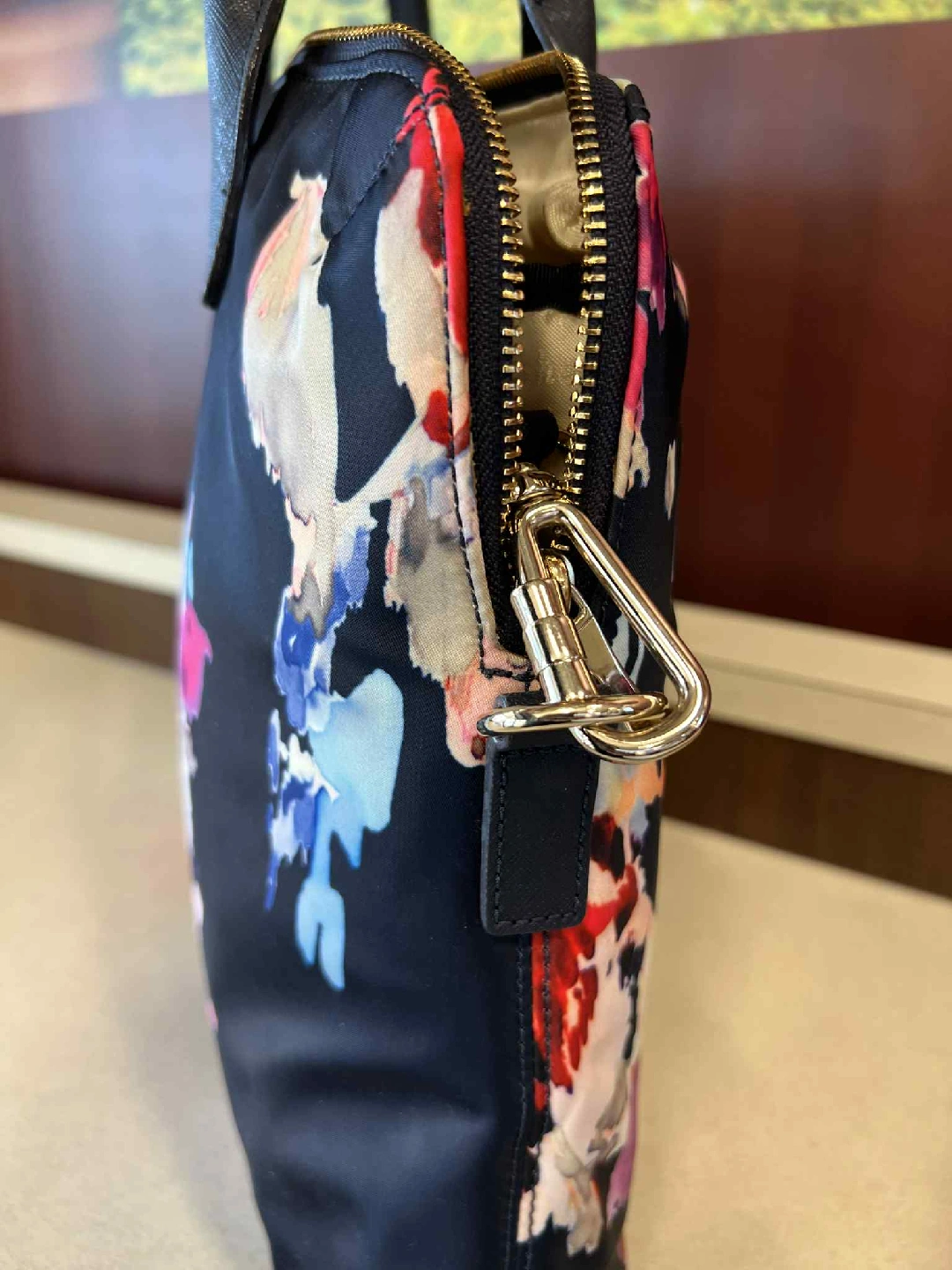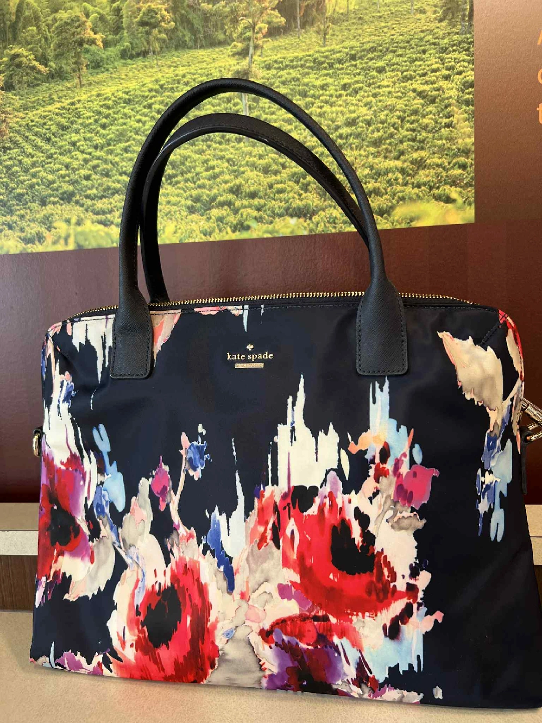 This Kate Spade laptop bag features a beautiful floral design. It has black handles and a gold zipper. Inside, there's a strap for securing your laptop. Perfect for adding a touch of style to your work or school days for in 15inch laptop 100% authentic pick up or deliver
