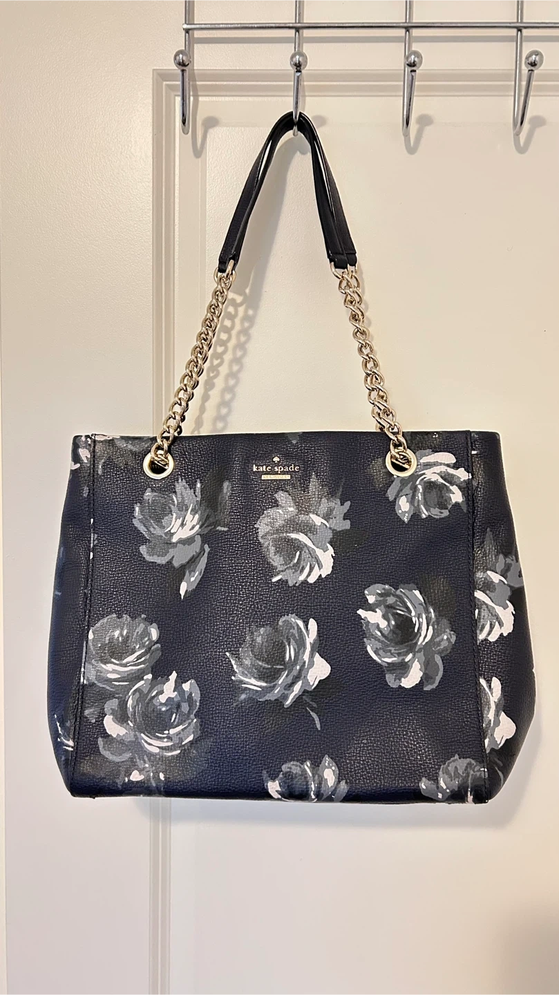 This is a Kate Spade tote bag featuring a floral print. It has chain and leather straps. It's like new!