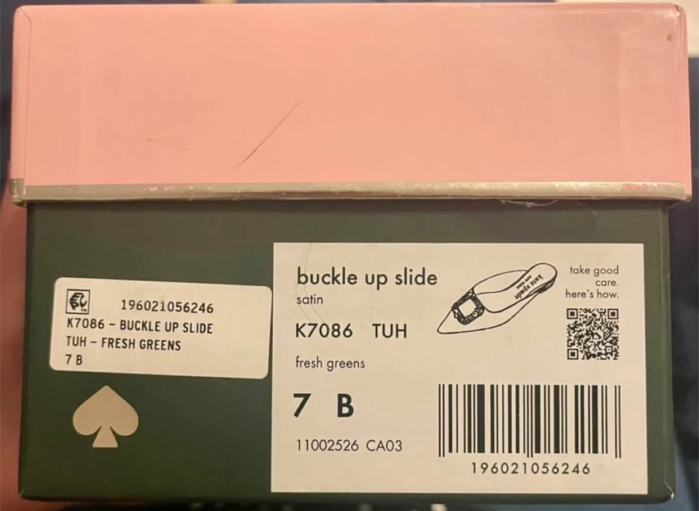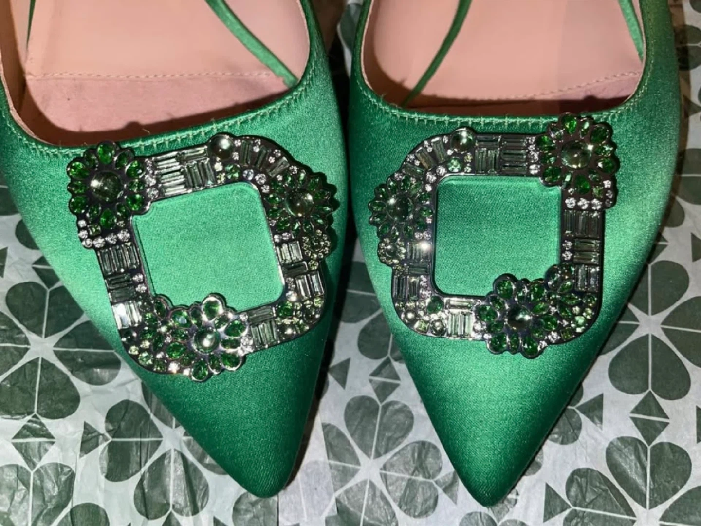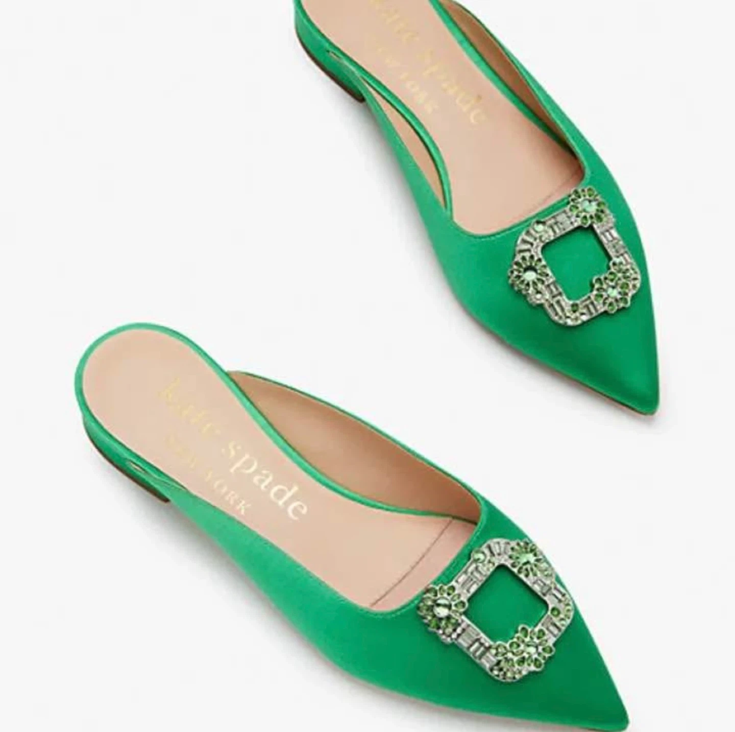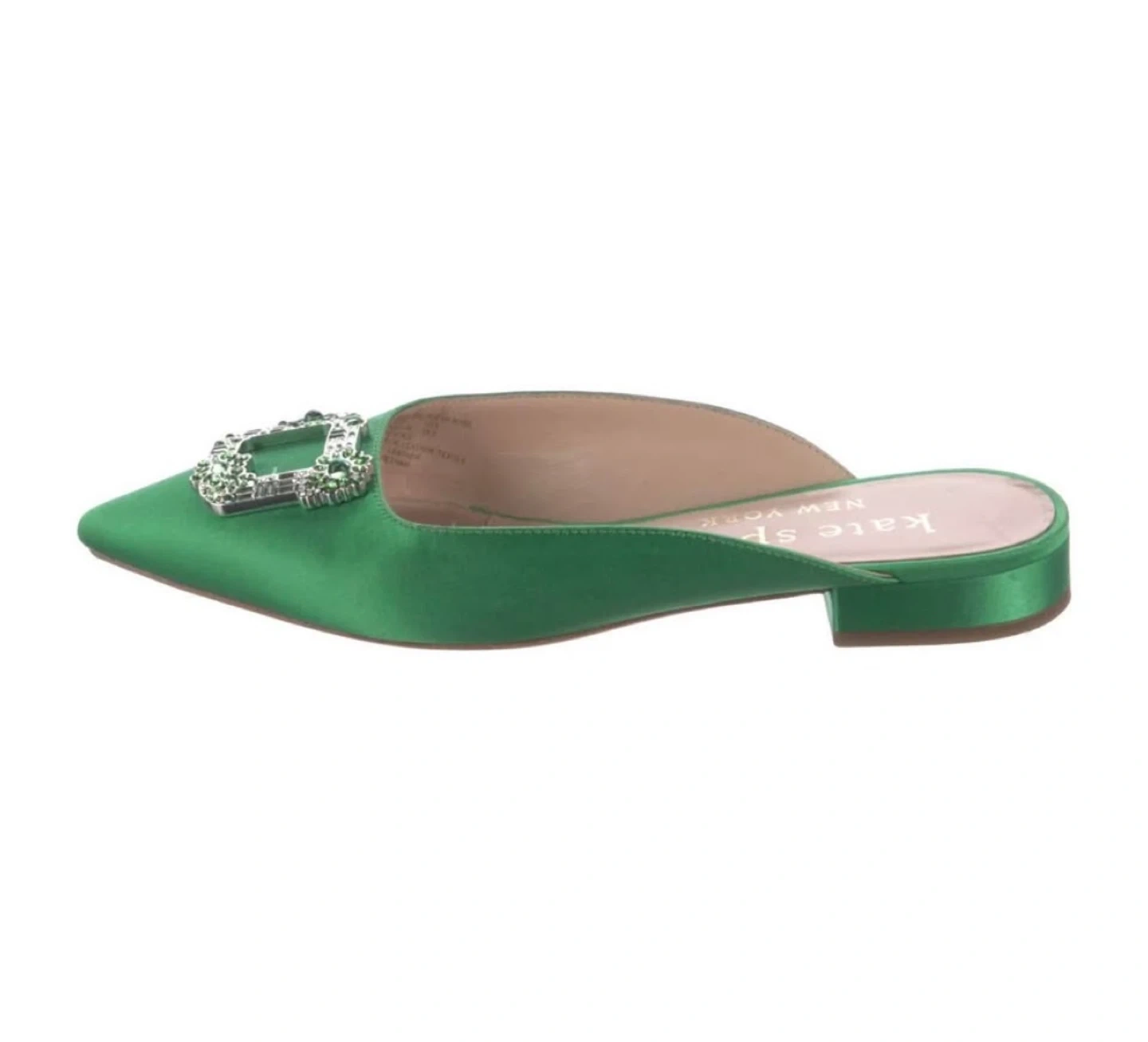 New in box, never worn outdoors. Size US 7. There are minor imperfections as pictured such as a scuff at the bottom tip of the pointed toe from being the last display pair but in overall excellent condition. These elegant flats from Kate Spade feature a vibrant green hue and a striking crystal buckle detail. Crafted with a luxurious satin finish, they offer a sophisticated touch to both formal and casual outfits. Originally $328 CAD + tax. Pickup at Queen Station. DETAILS: • Satin upper • Lining: 100% sheep leather • 0.75 inch wrapped block heel • Pointed toe • Embellished buckle detail at toe • Slide on