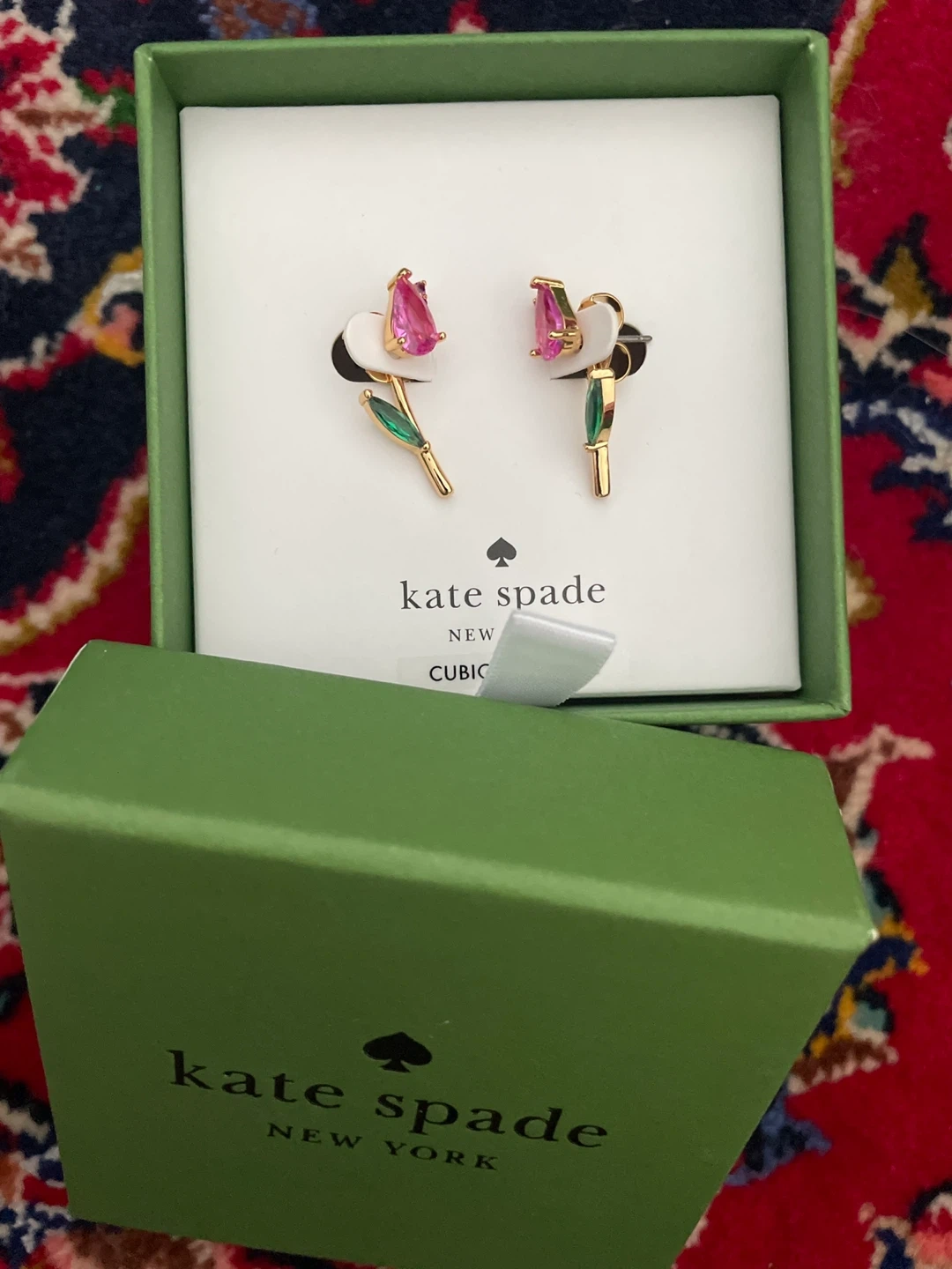 85These Kate Spade New York Cubic earrings are brand new and come in their original box! The earrings feature a gold tone with pink and green accents. Perfect for adding a touch of elegance to any outfit.