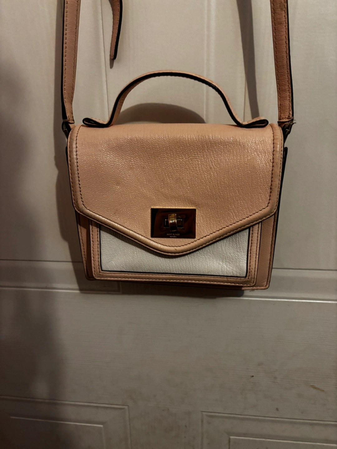 15KATE SPADE Nikki Walter Place Pink Cream Leather Crossbody Shoulder Bag $40 Front engraved turnlock plate and gusseted slip in pocket Single top handle with 2" drop Adjustable long strap with 20"+ drop Fully interior fabric lining Interior has 1 zipper pocket Approx measurement 8"W x 6"H x 2"D Condition is good