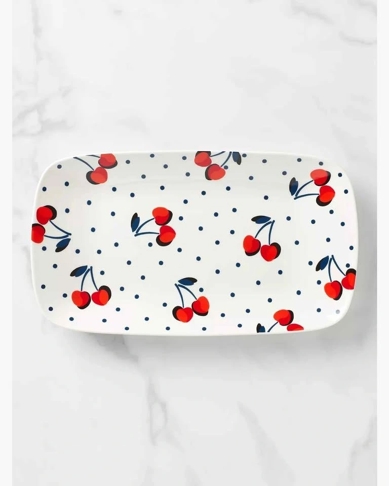67PICK UP IN THORNHILL NOT AVAILABLE AT RETAIL ANYMORE Kate Spade New York - Vintage Cherry Dot Hors D'oeuvres Tray Whimsical cherry and polka dot motif adds a playful, retro feel. Dimensions: 13.25"L x 7.5"W x 1.25"H Imported Porcelain Dishwasher and microwave safe PICK UP IN THORNHILL NOT AVAILABLE AT RETAIL ANYMORE