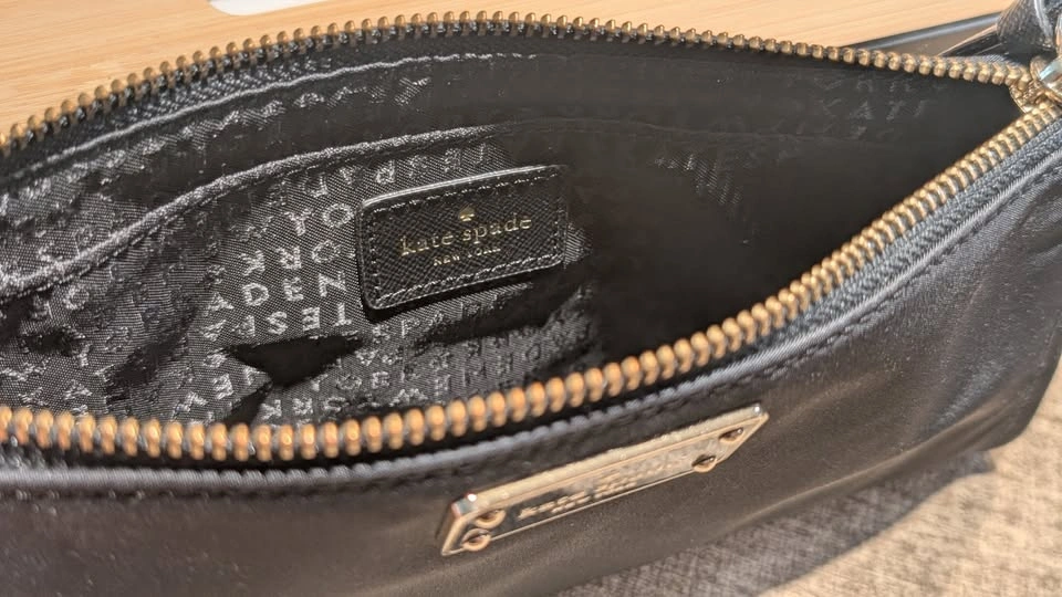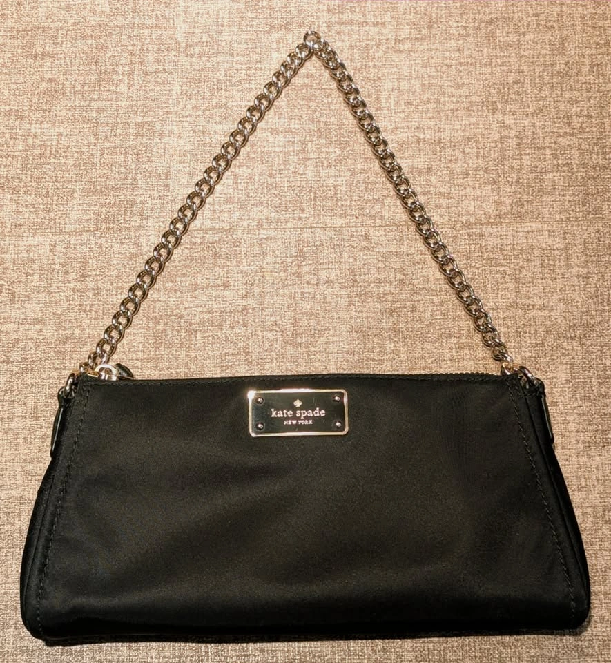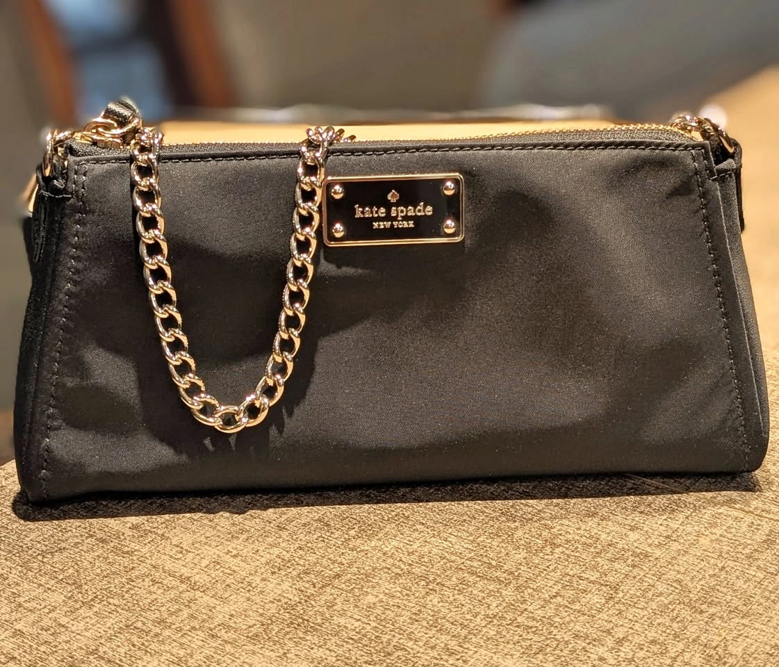 Beautiful Kate Spade convertible crossbody bag in sleek black nylon with elegant gold-tone hardware. Features the signature Kate Spade logo plate on the front. Strap is 105 cm; Bag is 25 cm (L) x 12 cm (H) x 4 cm (D) Versatile design: Wear as a clutch with chain strap or crossbody with adjustable leather strap. Black nylon exterior with gold-tone chain and hardware. Zip-top closure. Detachable/adjustable crossbody strap included. Compact size perfect for essentials. Classic Kate Spade style.