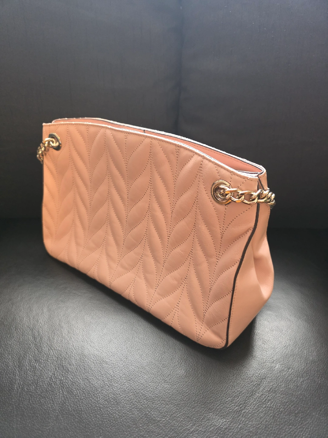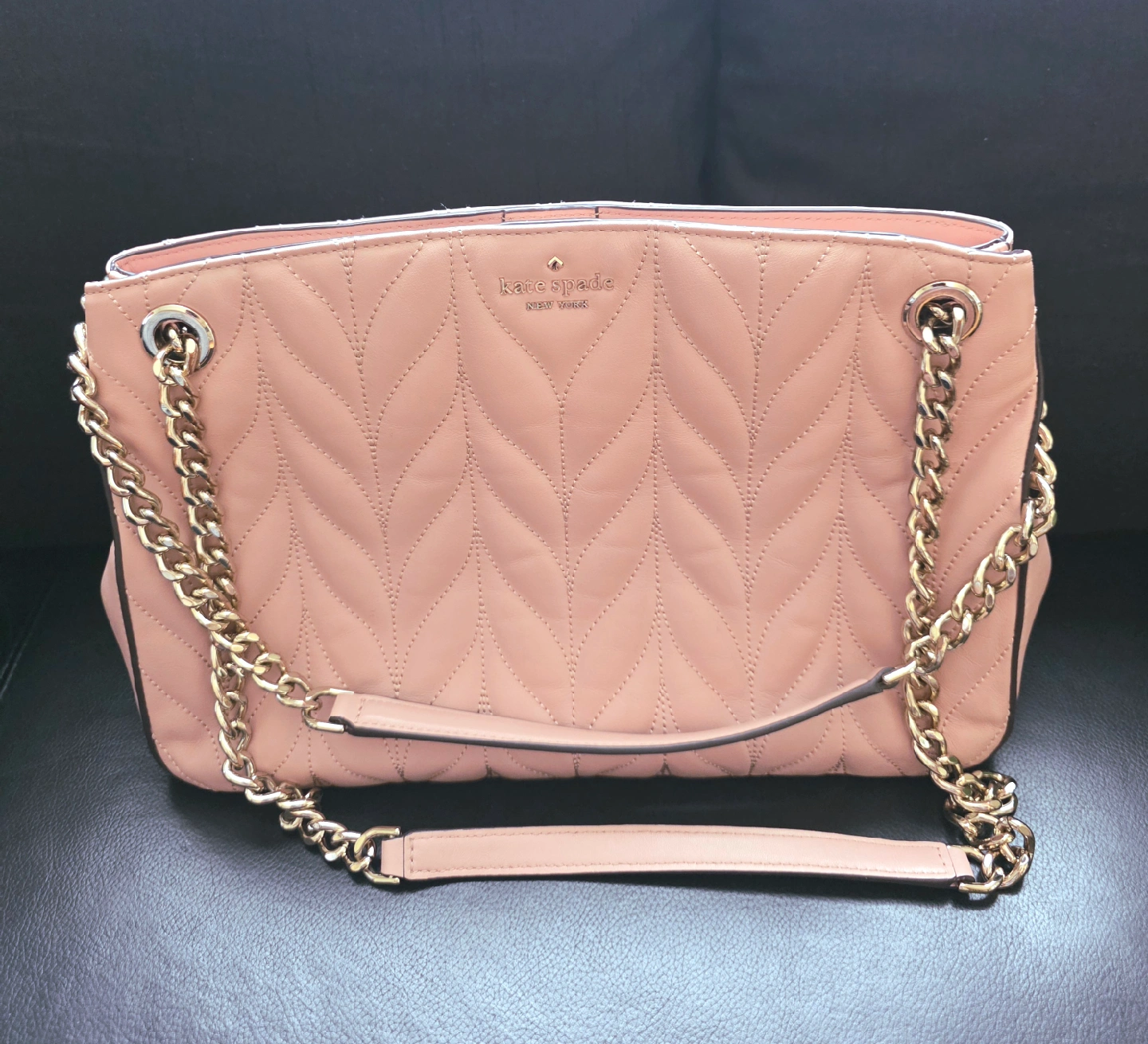 10Selling a Kate Spade shoulder bag in a lovely pink leather! It features a stylish quilted design and gold chain detailing. Perfect for adding a touch of elegance to any outfit