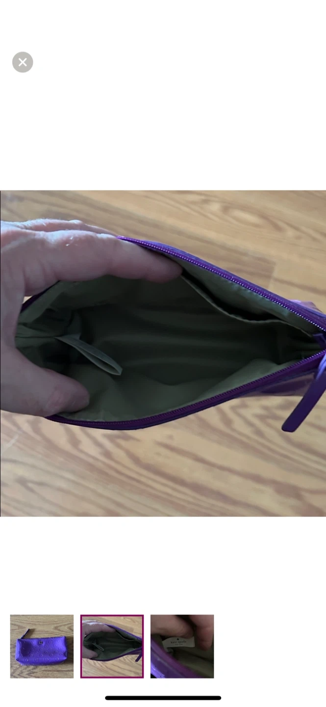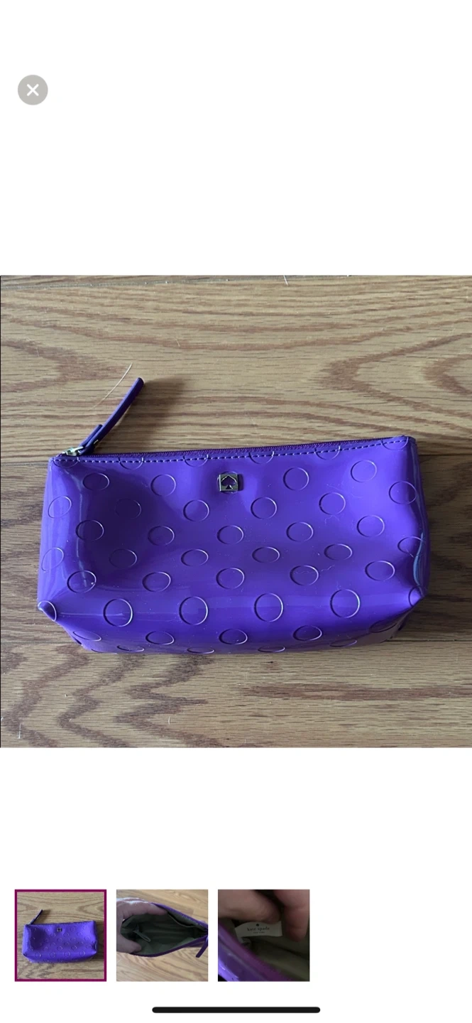 Here's a cute Kate Spade cosmetic bag in a vibrant purple colour! It features a fun polka dot pattern. Perfect for keeping your makeup and essentials organized on the go