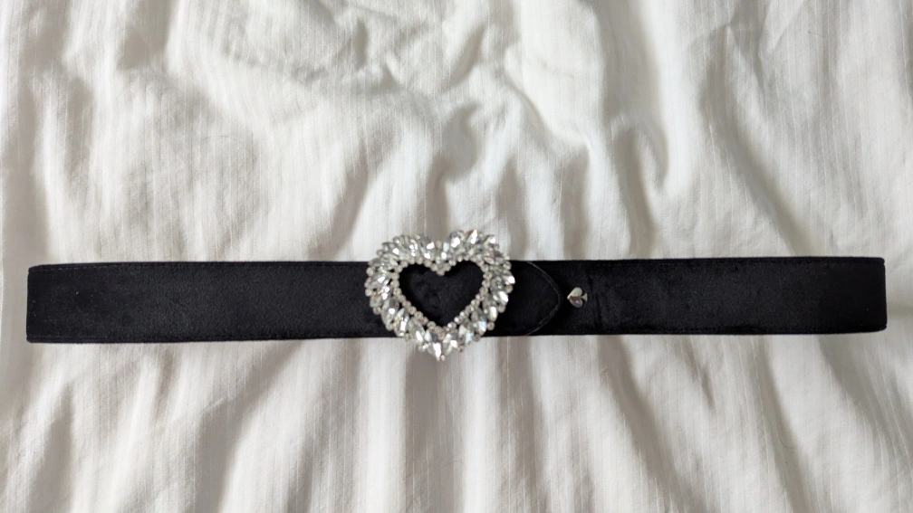 Selling a Kate Spade Stone Heart Belt belt! It's a size S/M and features a beautiful crystal heart-shaped buckle. The belt is made of velvet synthetic materials and is in excellent 'like new' condition (never worn). Perfect for adding a touch of sparkle to any outfit!