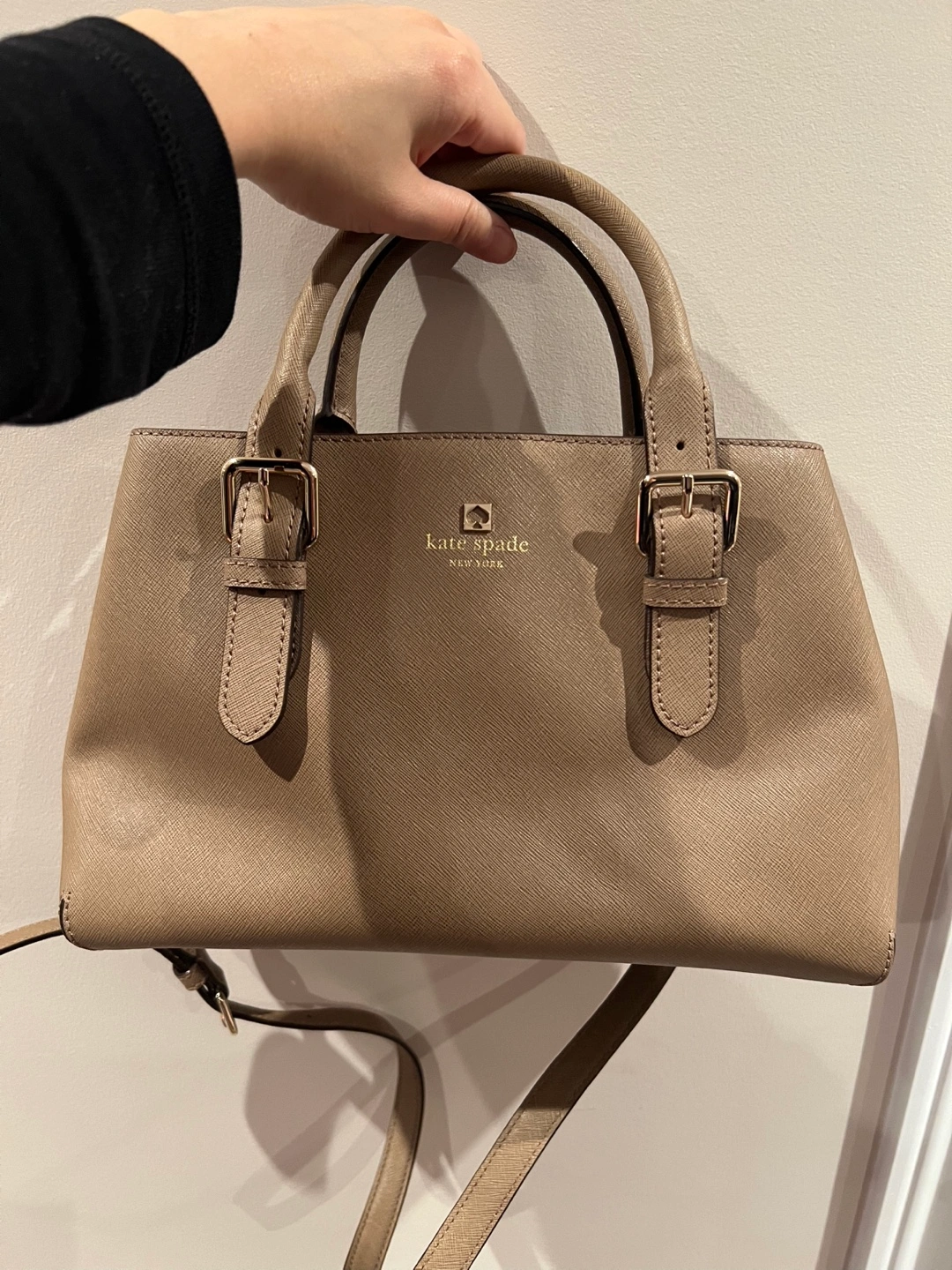 Beautiful taupe-coloured handbag. Features double buckle closures and adjustable and removable shoulder strap.