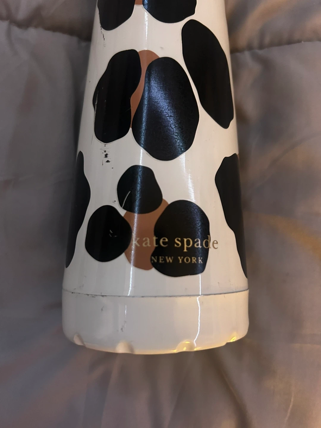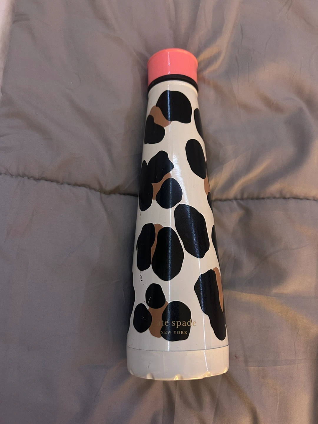 Kate Spade water bottle with a fun, spotted design! It's perfect for staying hydrated on the go. The bottle shows some signs of wear, but it's still in good condition and ready for a new home