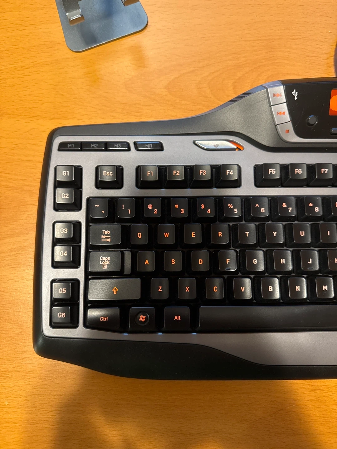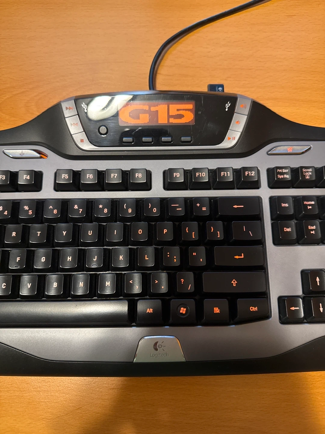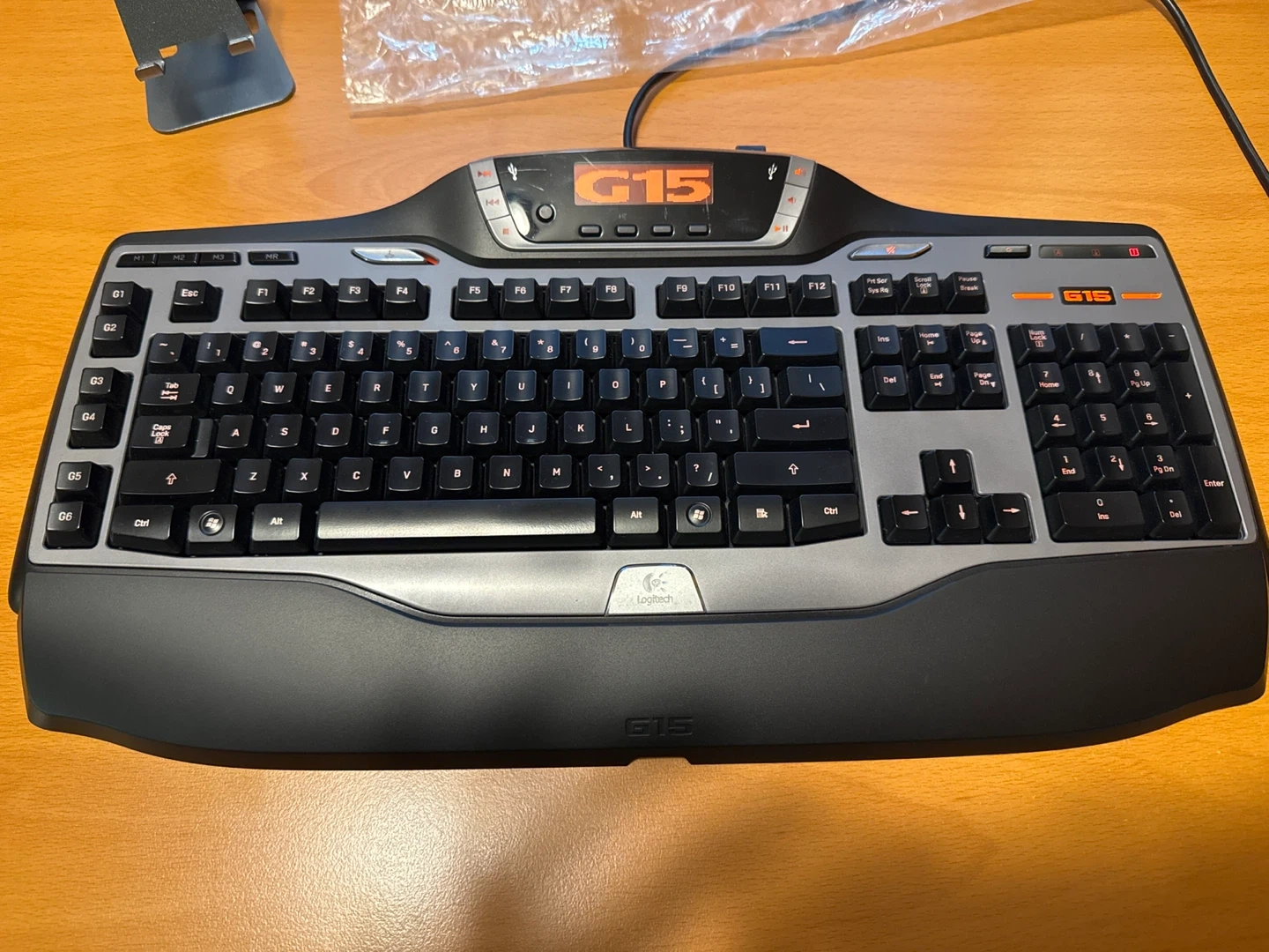 This is a Logitech G15 gaming keyboard in excellent condition. It has programmable G-keys for in-game macros. The screen displays game info and system stats. Backlit keys are orange.