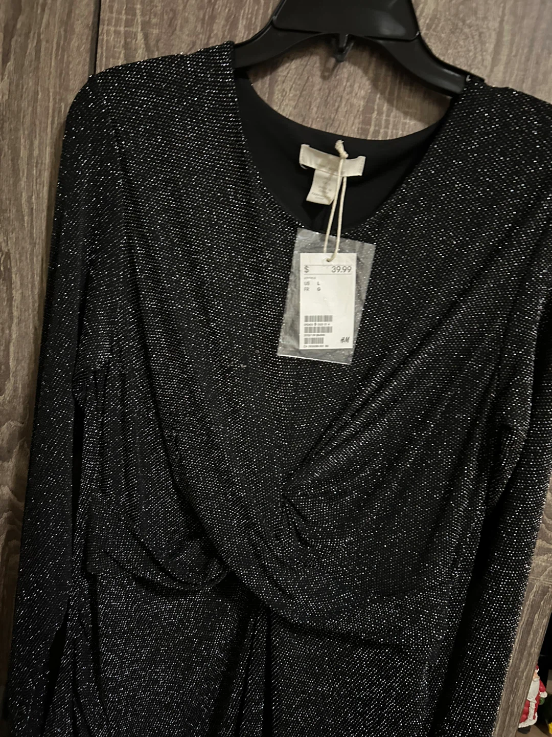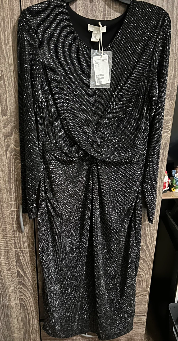 Selling a Brand new H&M black sparkly dress in size Large. It has a stylish twist detail at the front and long sleeves. Originally bought for $39.99!