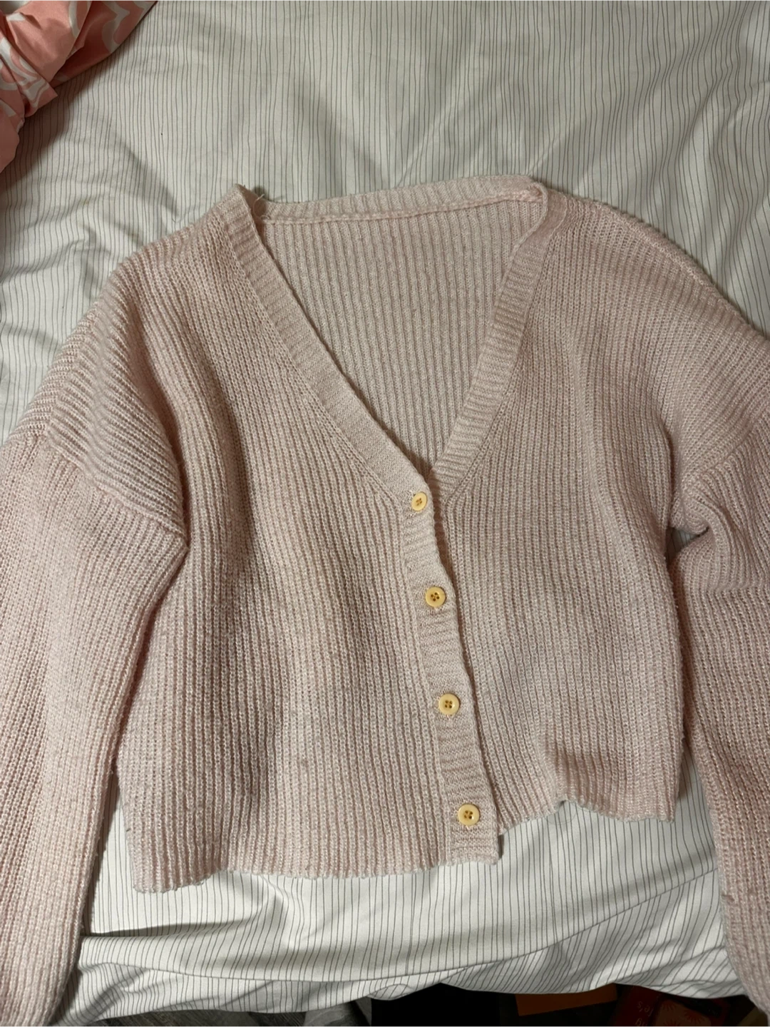 This is a cute, pink cropped cardigan with a ribbed knit texture. It features a V-neckline and button-up front. The material feels soft and cozy, making it a great layering piece.