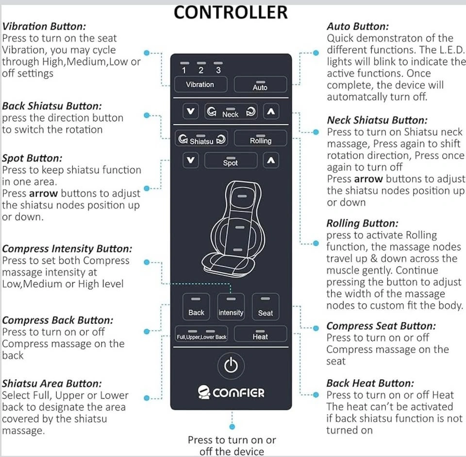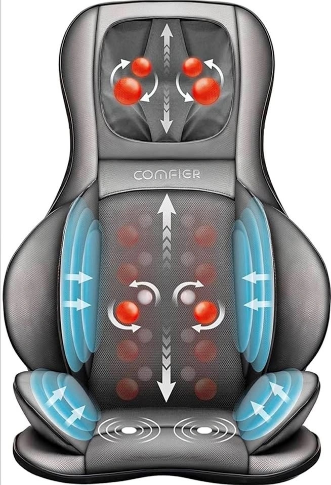 Brand new Comfier full body massage chair pad designed to provide relaxing shiatsu kneading massage for your neck, shoulders, and entire back. Includes soothing heat function and adjustable massage settings to help relieve muscle tension and stress. Portable design fits most office chairs, recliners, and home chairs, making it great for daily relaxation or as a thoughtful gift.