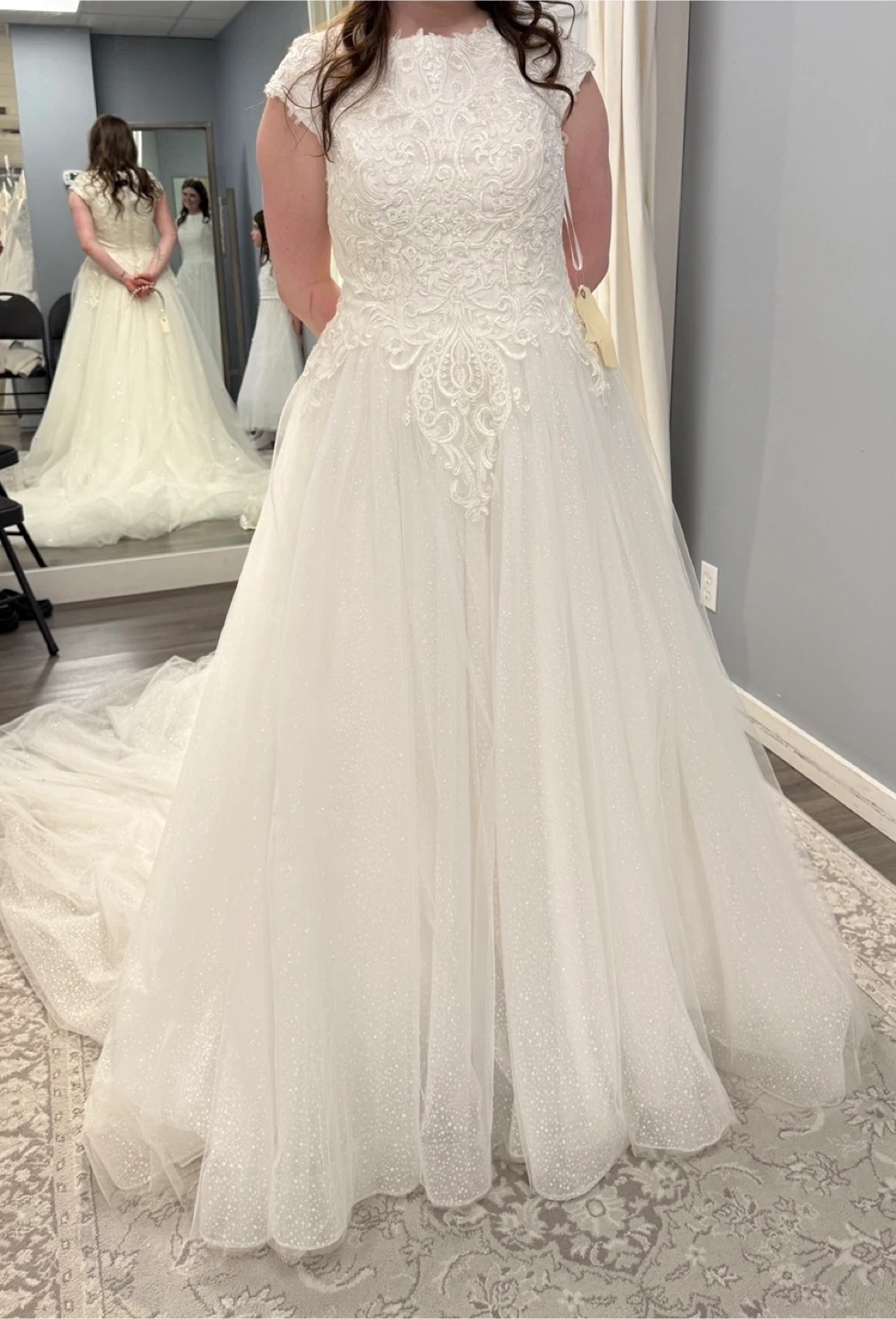 This beautiful white wedding dress features a lace-detailed bodice and cap sleeves. The full tulle skirt has a subtle sparkle effect. It's perfect for a wedding day!