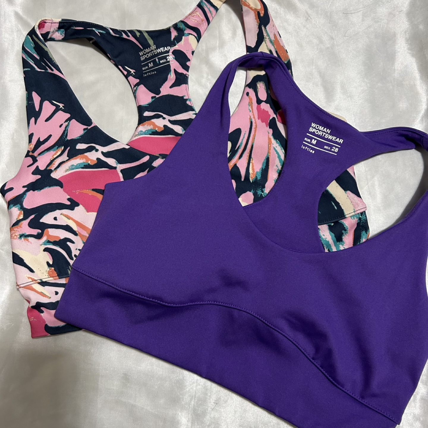 Two Lefties sports bras in size M. One is a solid purple color and the other has a pink floral pattern. Both are in great condition and ready for your next workout!