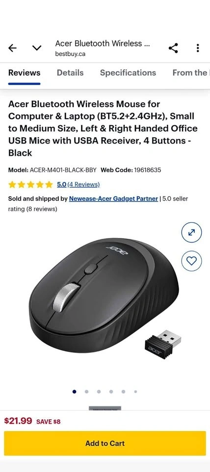 Never used Acer Bluetooth Wireless Mouse for Computer & Laptop (BT5.2+2.4GHz). Small to Medium Size, Left & Right Handed. Office USB Mouse with USBA Receiver, 4 Buttons - Black. Let me know if you're interested!