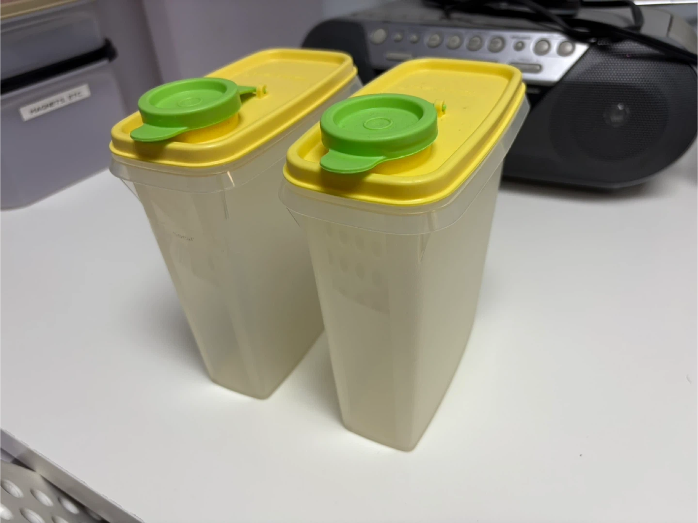 Get this set of two Tupperware cereal containers. They're a creamy beige colour with yellow lids and green flip-top pour spouts. These are great for storing kids snacks, baby cereal, etc.