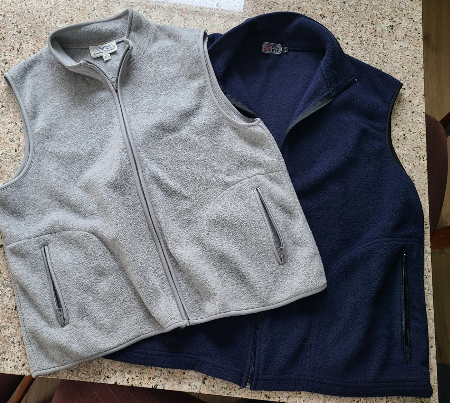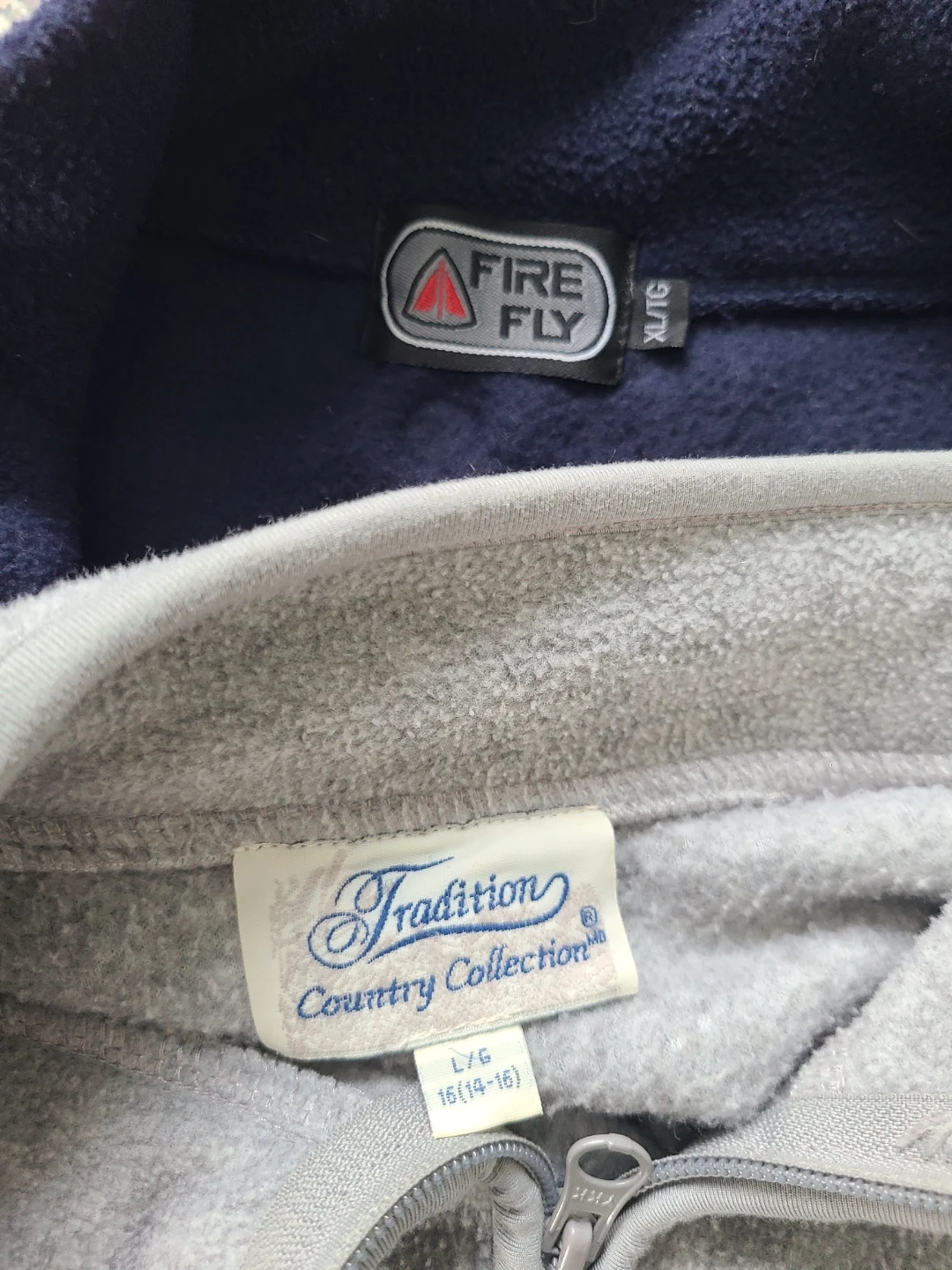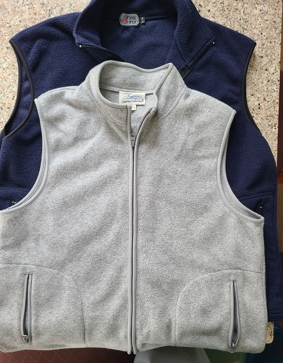 Bundle of two fleece vests. One is navy blue,Firefly, size XL/TG. The other is light grey,Tradition Country Collection, size L/G (14-16). Both have zippered pockets and zip-up fronts. Great condition $10 Each or $15 for Both