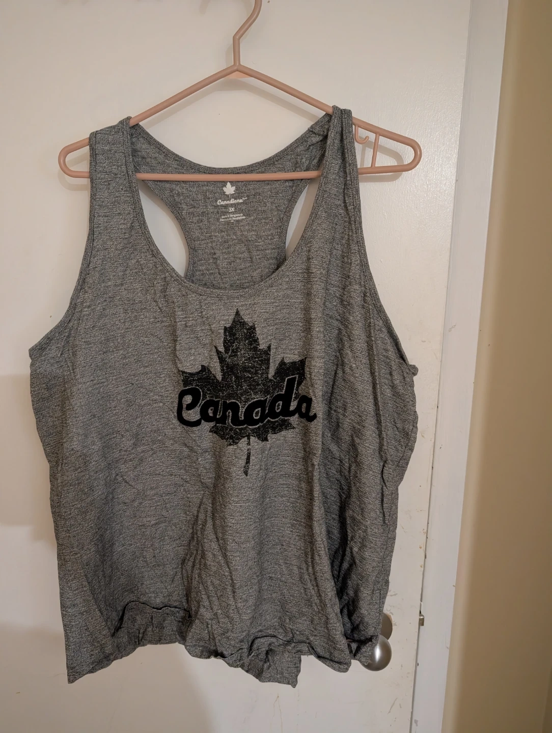 This grey tank top is from Canadiana and features a black maple leaf with "Canada" printed on it. It's a size 3X. The material appears to be a soft jersey knit. It's a racerback style.