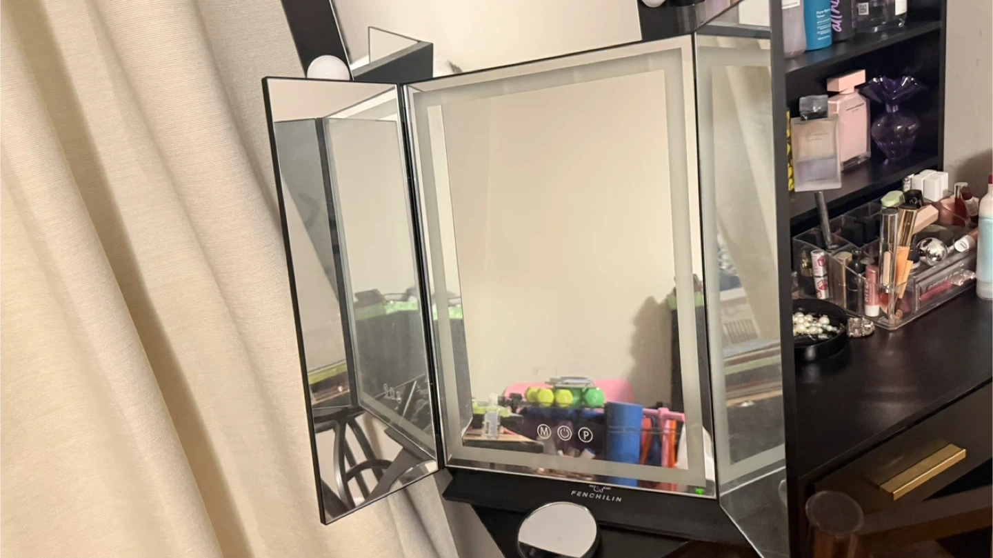 This FENCHILIN vanity mirror has three panels and built-in LED lights with touch controls. It's ideal for makeup application and grooming. The tri-fold design allows for a wider view.