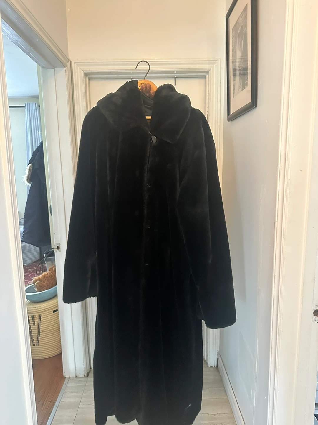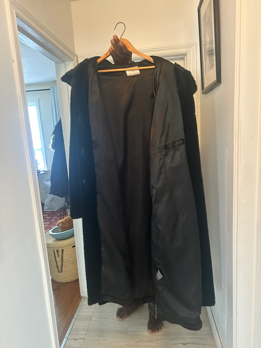 A cozy black faux fur coat with hood and a satin lining. This full-length coat features a button-up front and a classic collar. It's perfect for keeping warm on chilly days!