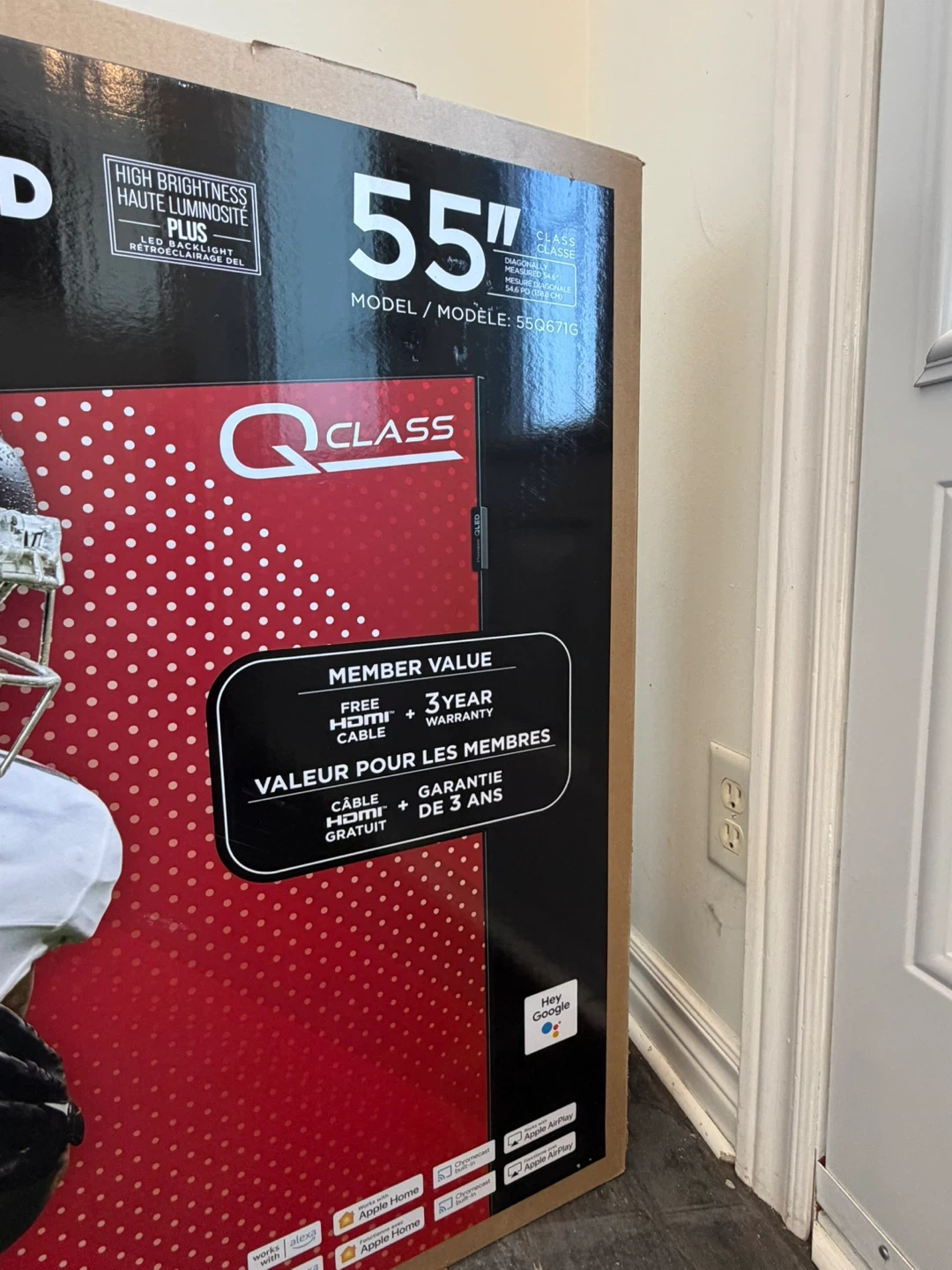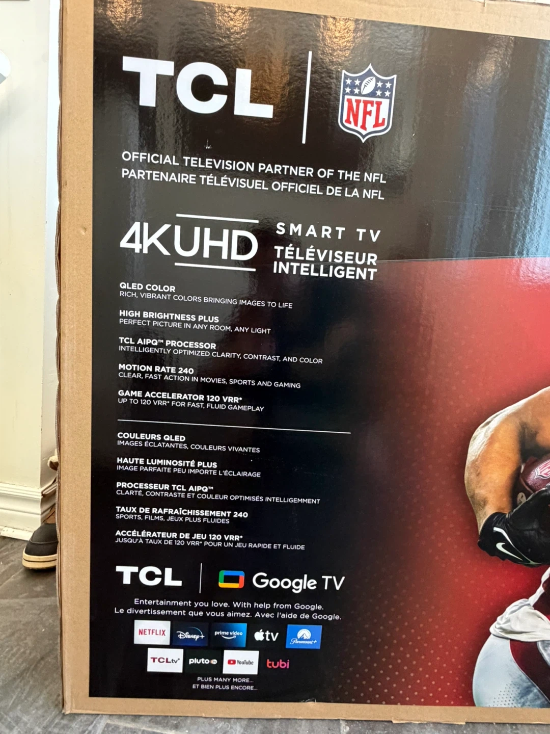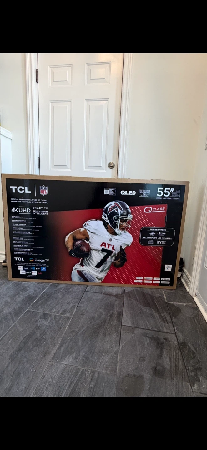 Selling a brand new TCL 55" Q-Class 4K UHD QLED Smart TV, still in its original packaging! This TV is an official television partner of the NFL, boasting QLED colour for rich, vibrant images and High Brightness Plus for perfect picture quality in any room. It also features Motion Rate 240 for clear, fast-action viewing.