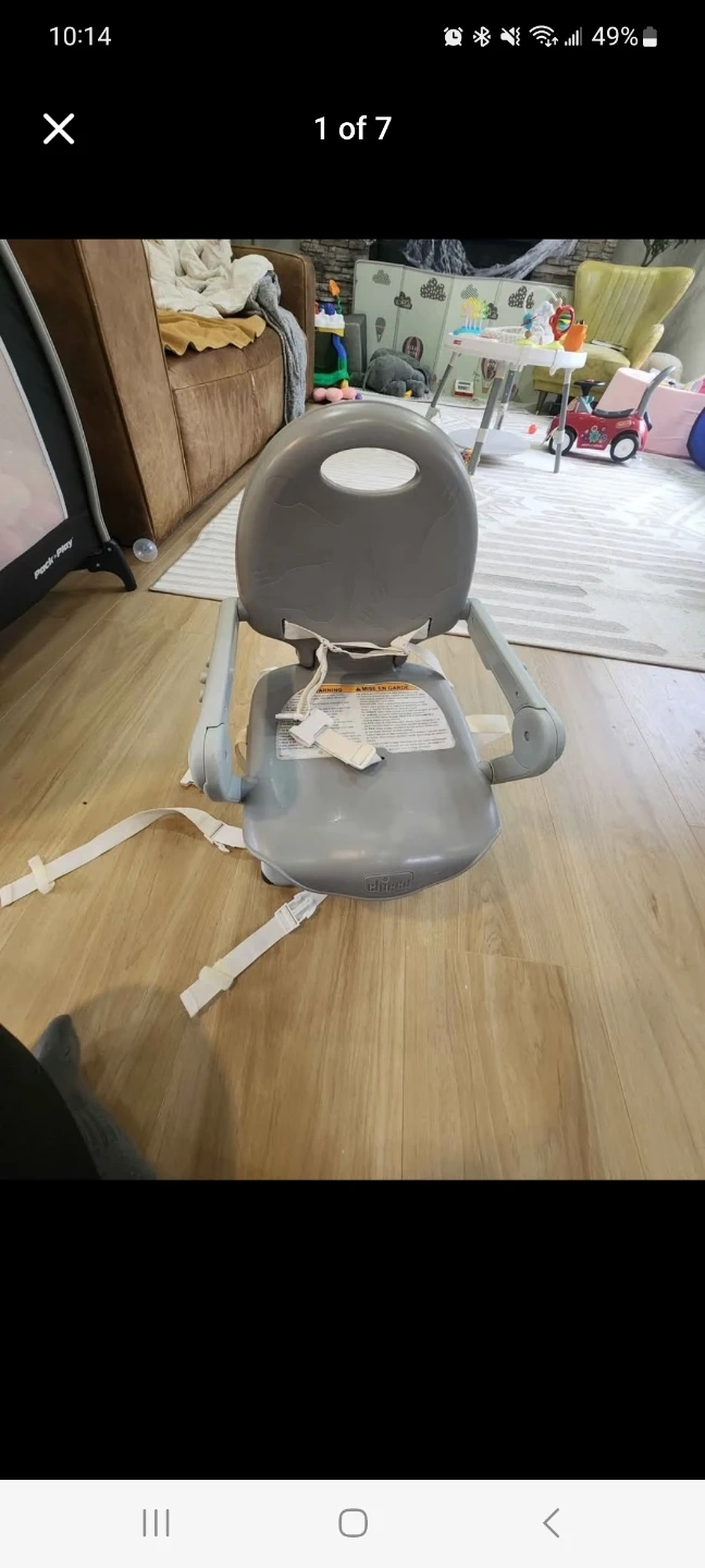 Grey Chicco portable high chair with removable tray. It has adjustable straps for securing to a chair. Easy to clean and convenient for travel!