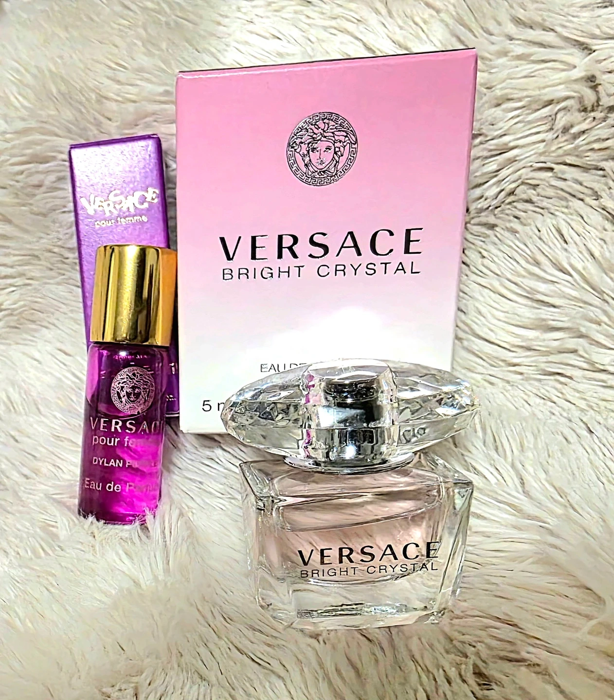 This set includes a travel size Versace Bright Crystal Eau de Toilette 5ml, and a travel-size Dylan Purple Eau de Parfum 3ml.