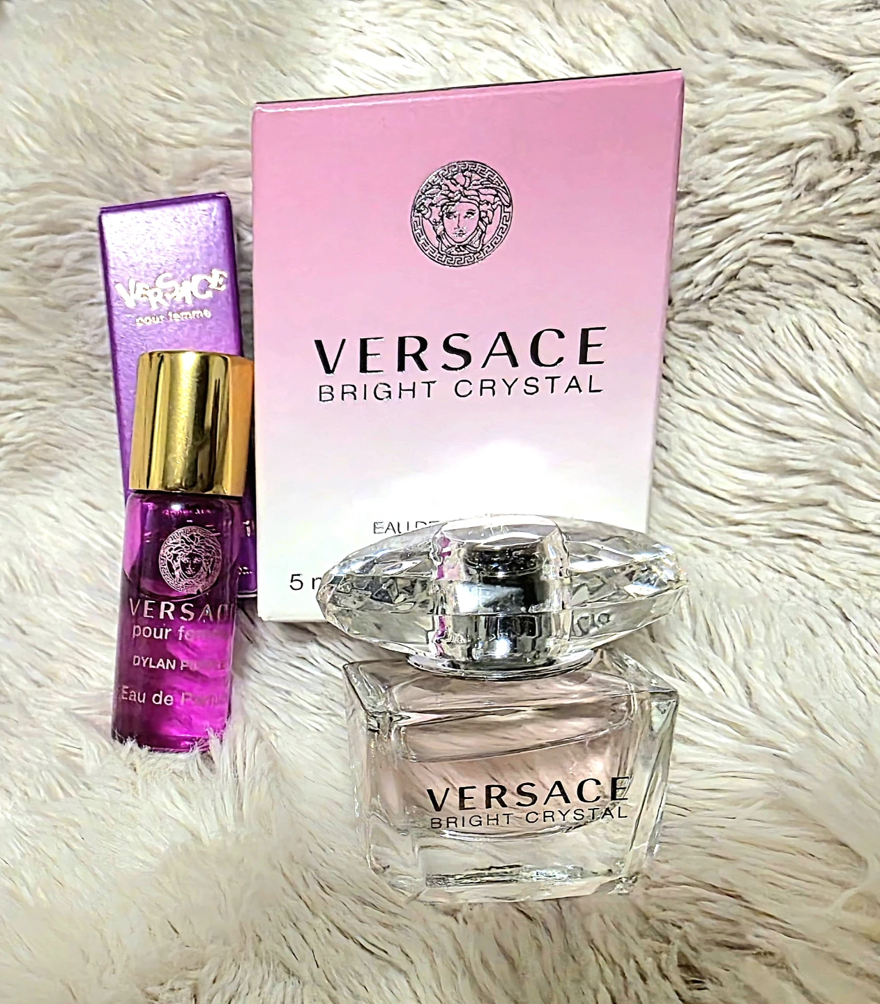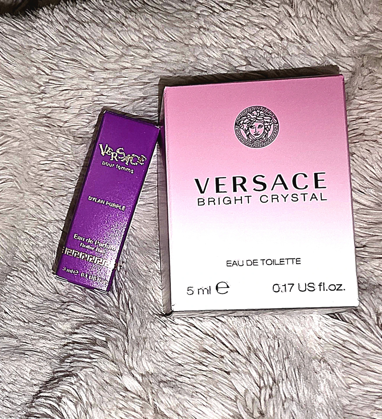 This set includes a travel size Versace Bright Crystal Eau de Toilette 5ml, and a travel-size Dylan Purple Eau de Parfum 3ml.