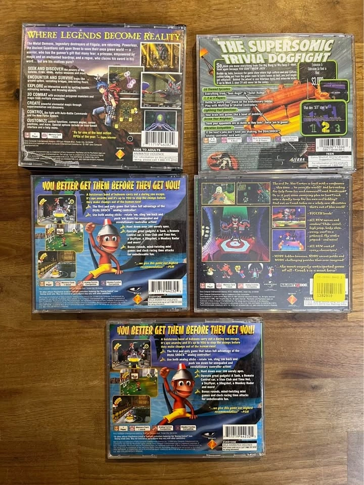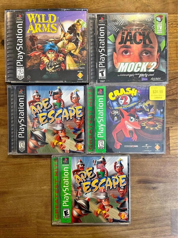 Various PS1 games available for sale. All are CIB, tested and working unless otherwise noted. Wild Arms (missing manual, crack on back of case) - $65. Ape Escape (black label) - $55. Ape escape (greatest hits) - $45. Crash 2 - $20. You don’t know jack 2 - $5. Pickup in Glenbrook SW - cash only please.