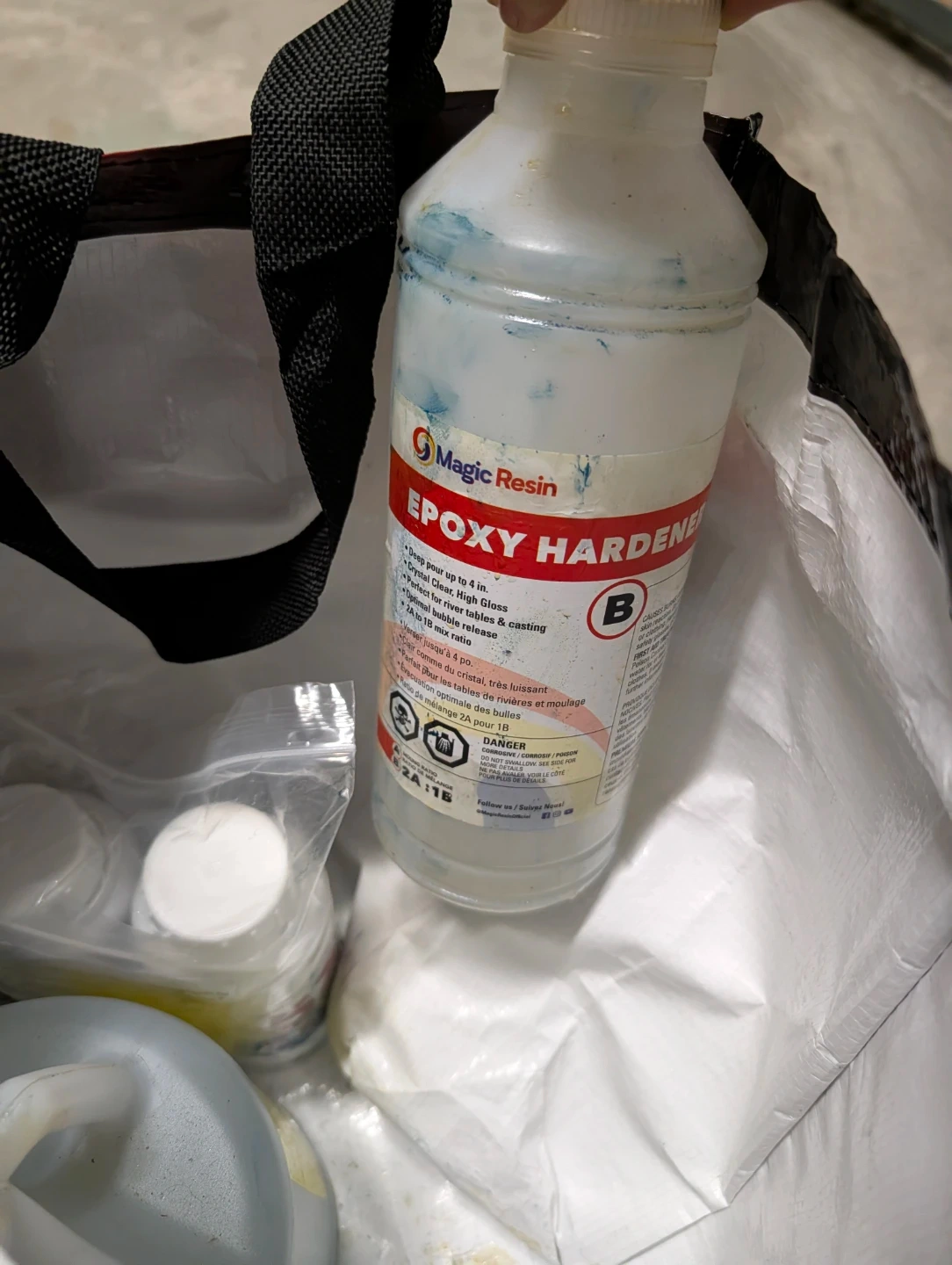 This is Magic Resin Deep Pour & Casting Epoxy Resin with a compatible hardener. It's formulated for creating clear, high-gloss pours up to 4 inches thick. The epoxy has a 2A:1B mix ratio for optimal results. There's a ton left because I only used it once.