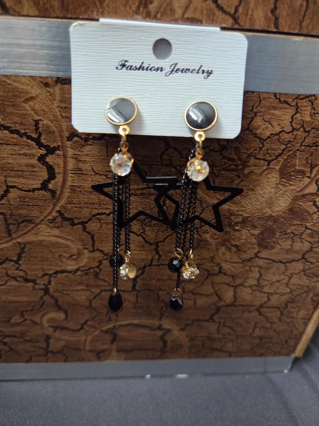 Stylish dangle earrings with black beads and clear crystal accents. These earrings feature a unique star charm and a gold-tone finish. They're designed to add a touch of elegance to any outfit.