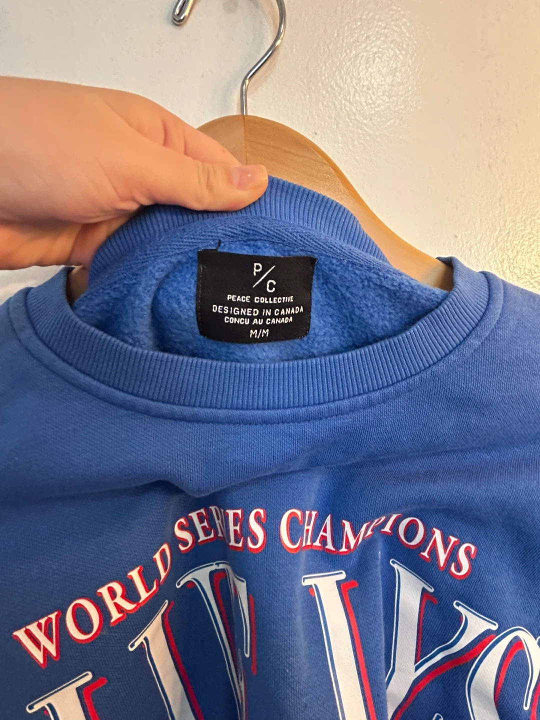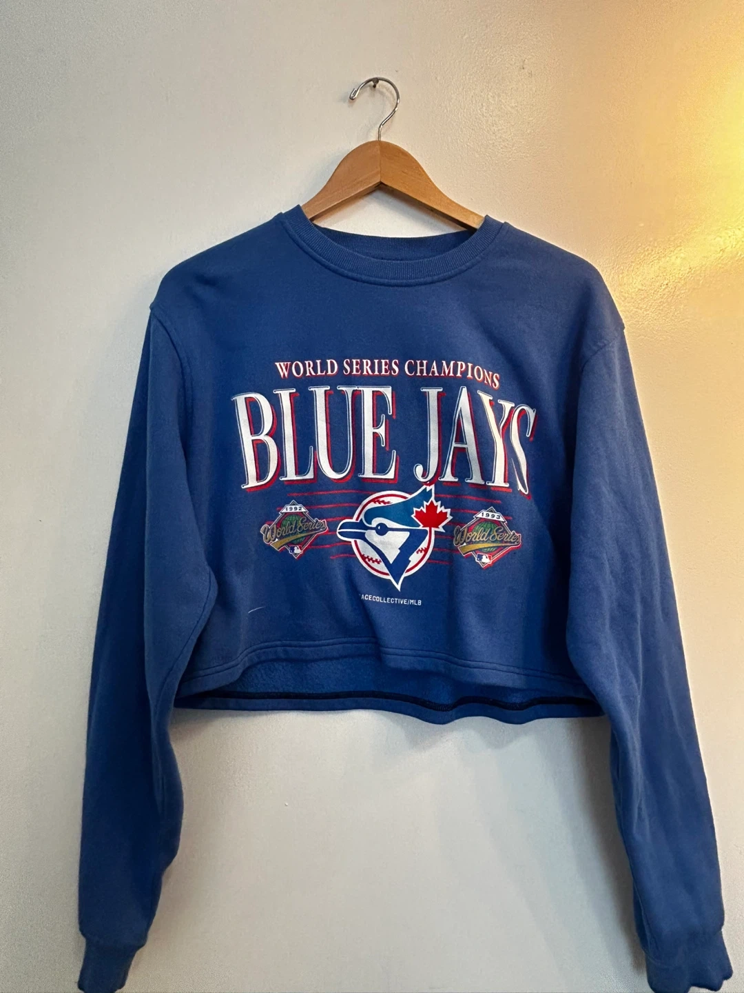 Awesome blue cropped sweatshirt featuring the Blue Jays "World Series Champions" graphic. It's a size M/M and designed in Canada. Super comfy and stylish!