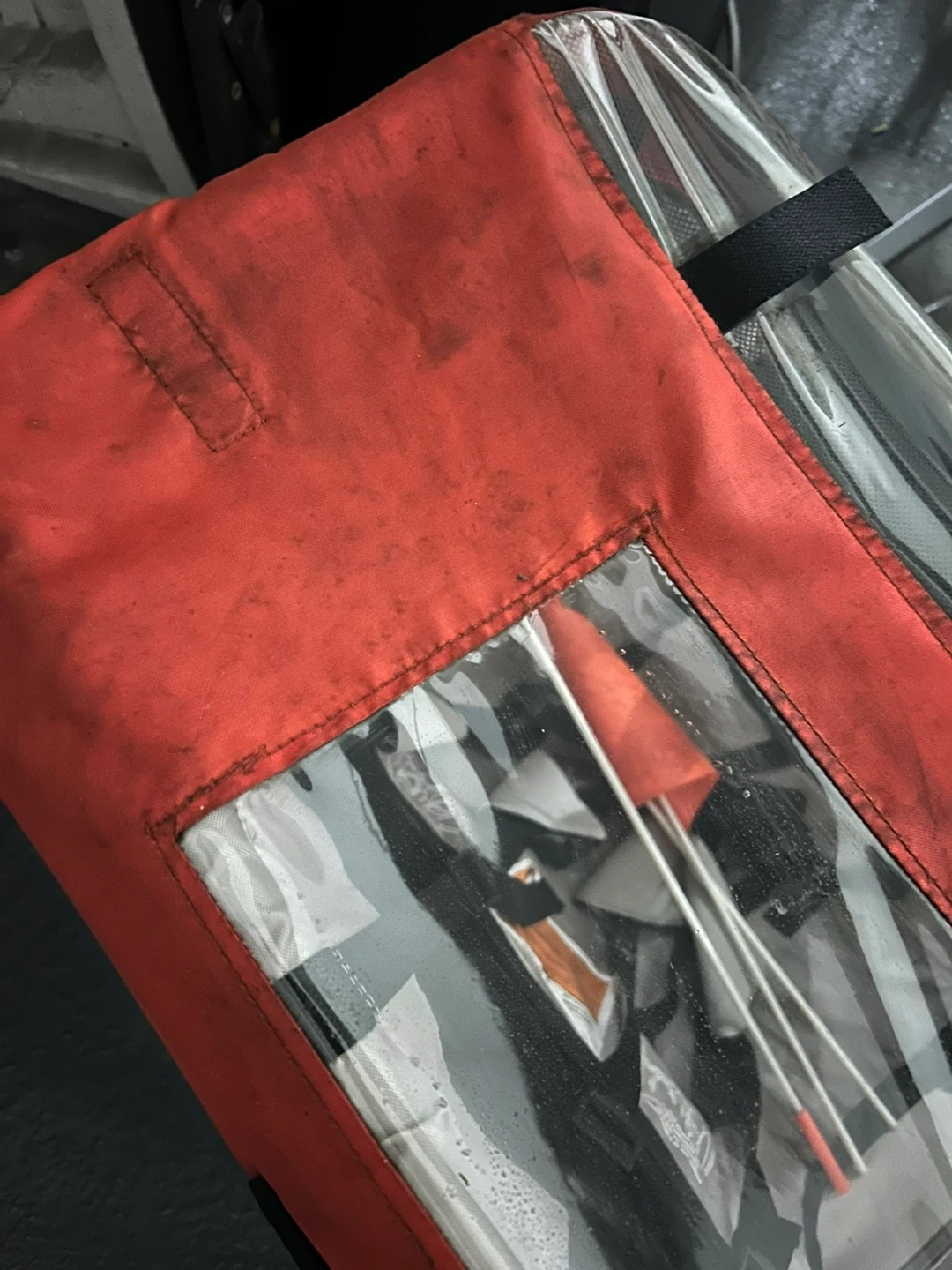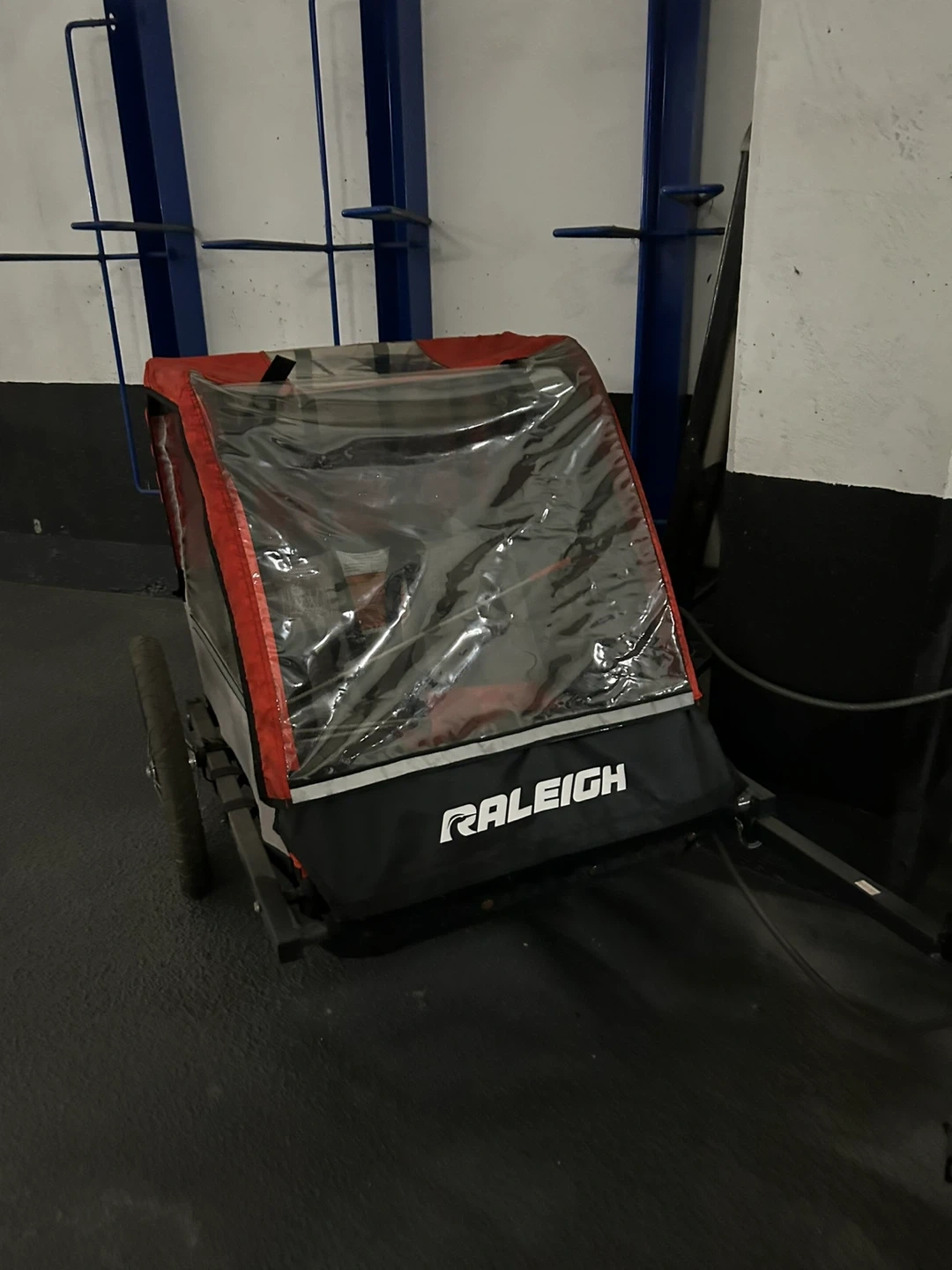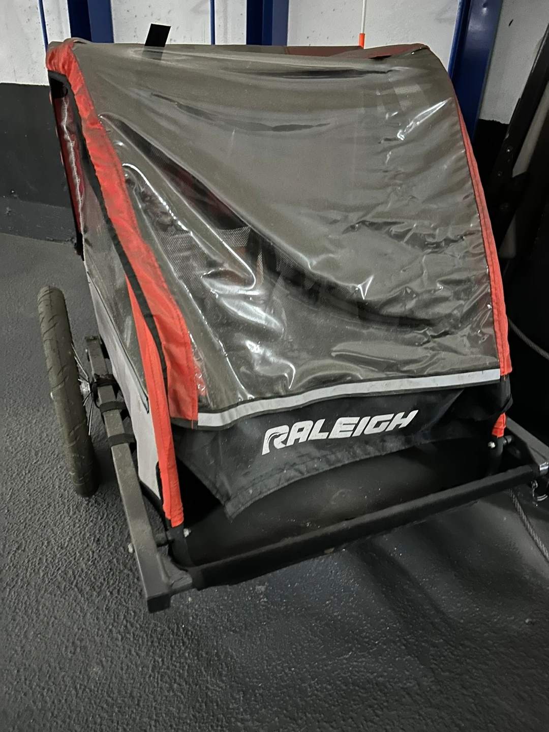 This Raleigh bike trailer is great for hauling your gear or kids. It's red and grey with a clear cover. It's a bit dirty but otherwise in good shape. It attaches to your bike for easy transport.