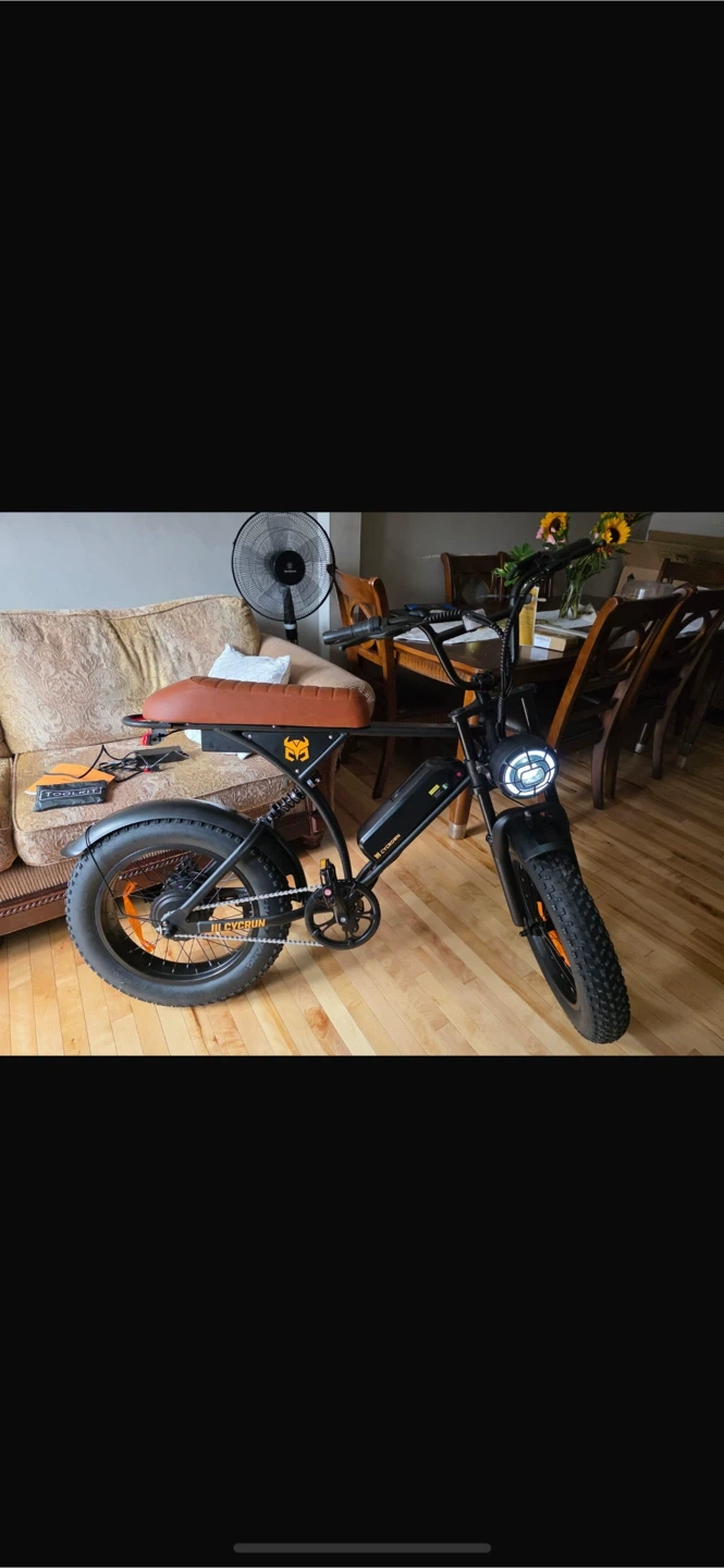 This is a black electric fat bike with a comfortable brown seat. It features a powerful motor and front suspension for a smooth ride. It's great for cruising around town or hitting the trails!