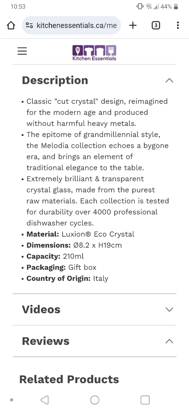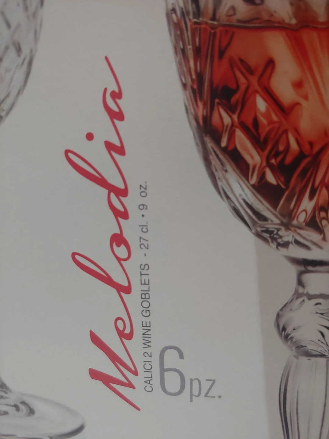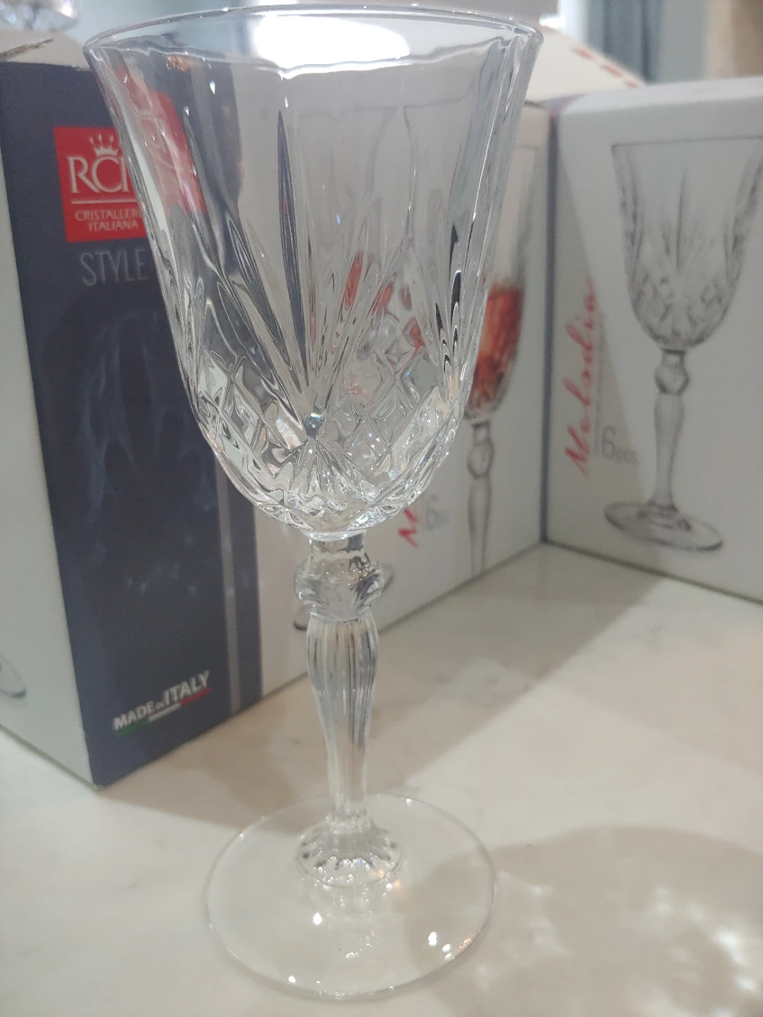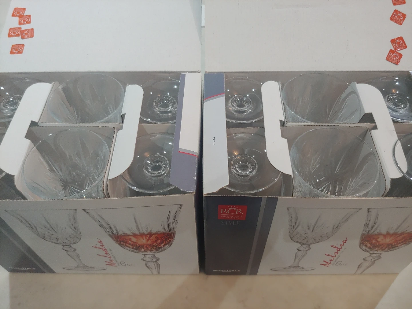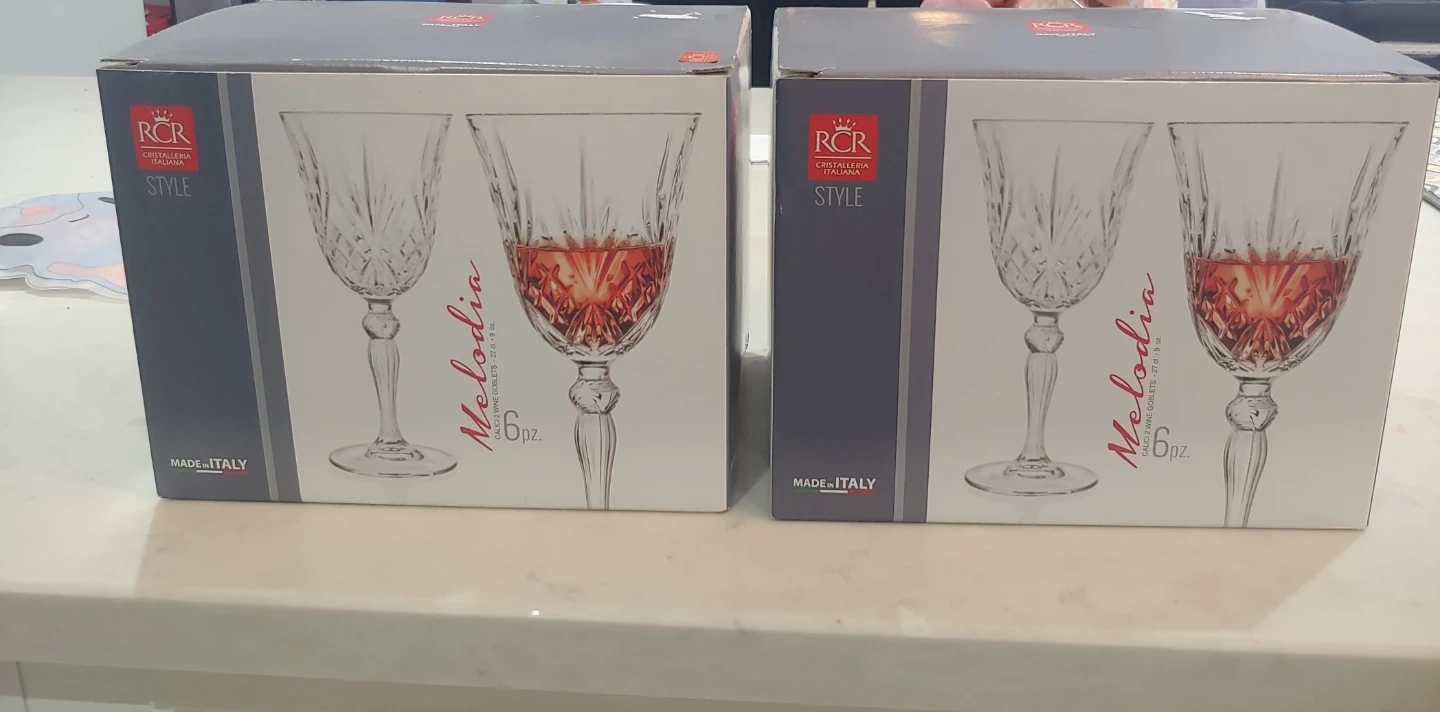2 new sets of 6 RCR Melodia crystal wine goblets. They're made in Italy and hold 27 cl or 9 oz each. I removed the stickers off the glasses but never used them. See photos for more details.