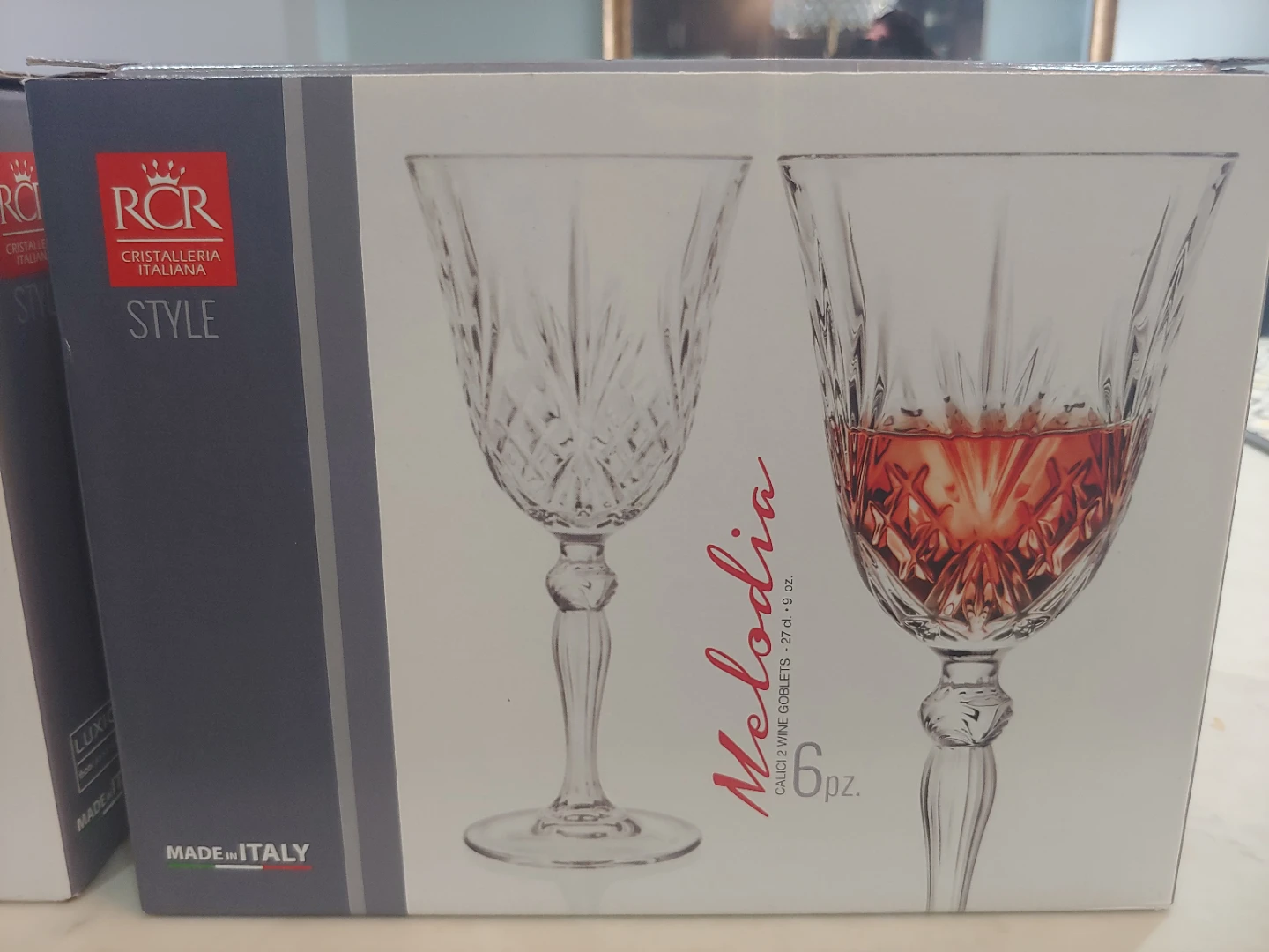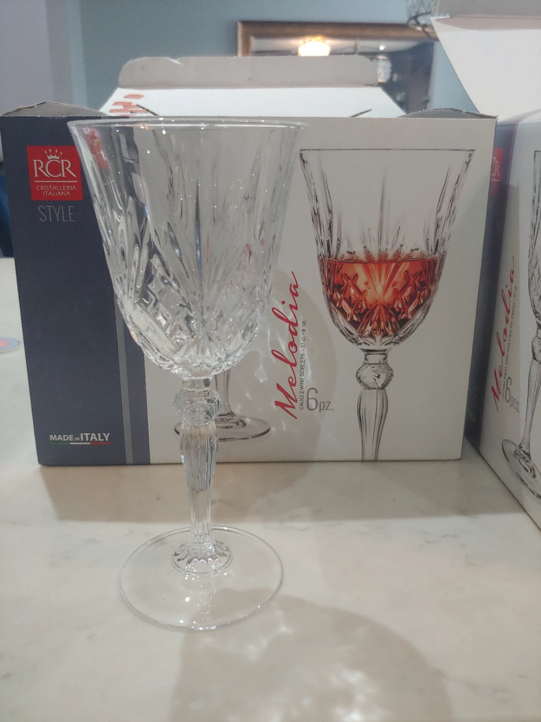 2 new sets of 6 RCR Melodia crystal wine goblets. They're made in Italy and hold 27 cl or 9 oz each. I removed the stickers off the glasses but never used them. See photos for more details.