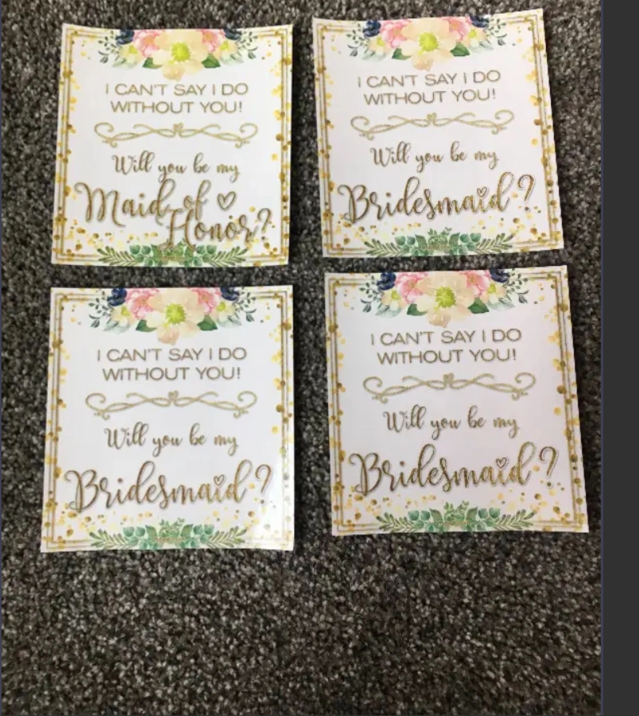 Set of 4 stickers. Floral design. Gold lettering. Perfect for asking your bridal party to join you on your special day. To put on wine bottles.