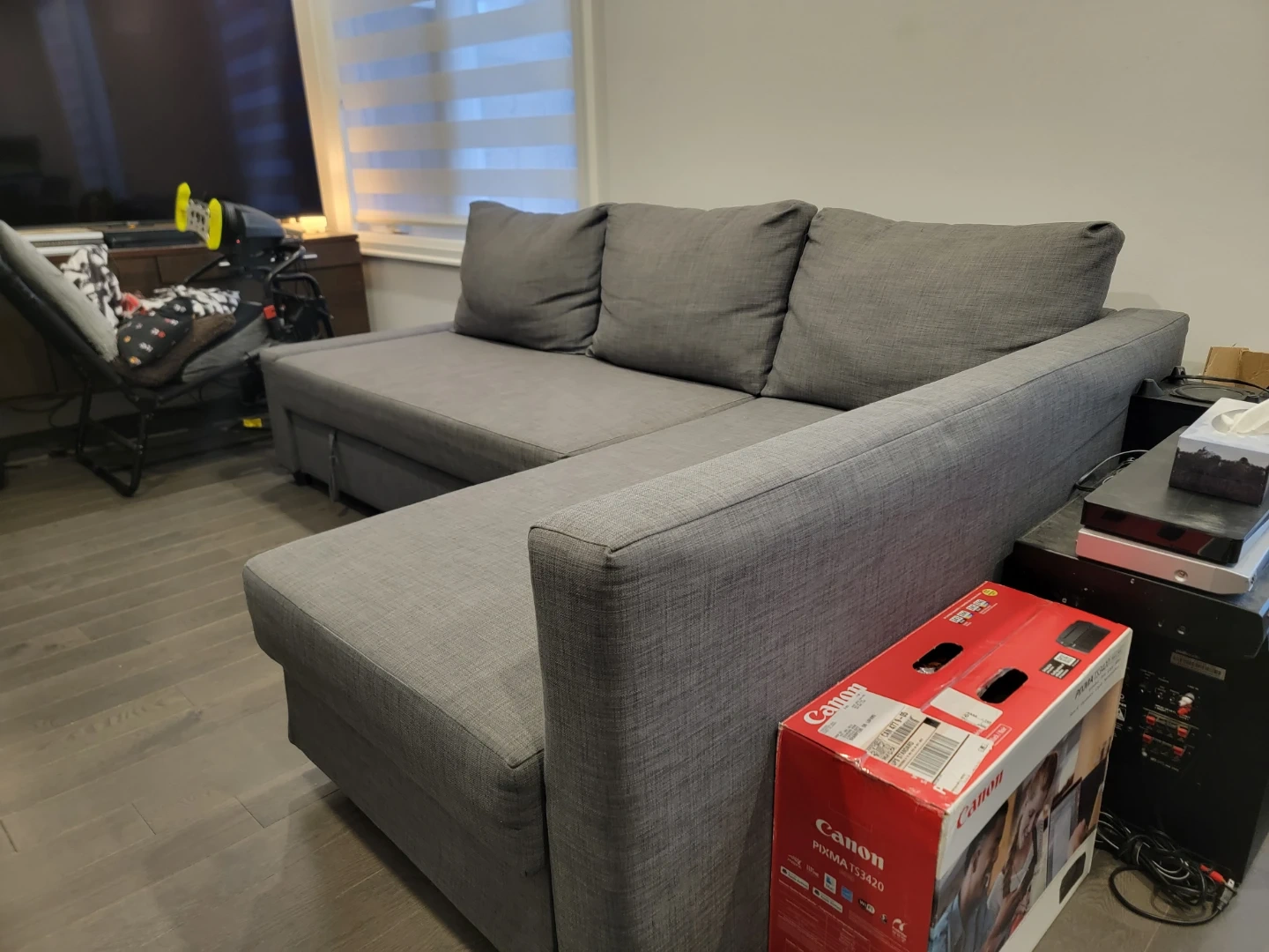 This IKEA FRIHETEN grey sectional sofa features ample under-seat storage, perfect for stowing away blankets and pillows. It easily converts into a pull-out bed for guests. The fabric is a durable grey weave. Couch's short end can be flipped to the other side!