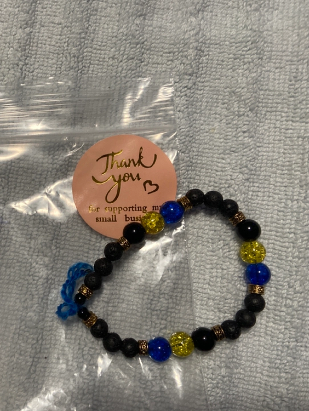 Hand crafted Black lava rock beads with blue and yellow glass beads, gold coloured spacers. Barbados style glass beads