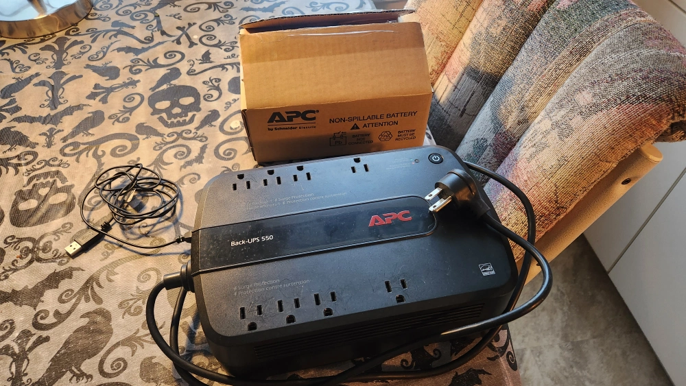 APC Back-UPS 550 Uninterruptible Power Supply. Includes replacement new battery. Used but working, great condition. Power cord and USB power chute cable included.