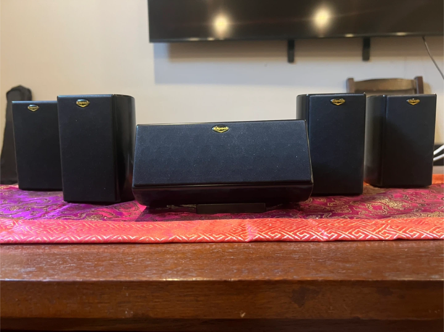 Klipsch 5.1 speaker system in black. Includes center channel and four satellite speakers. These are great for a surround sound setup!
