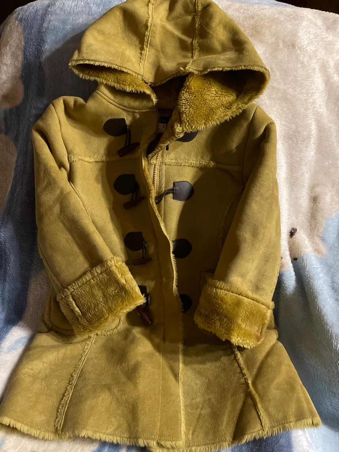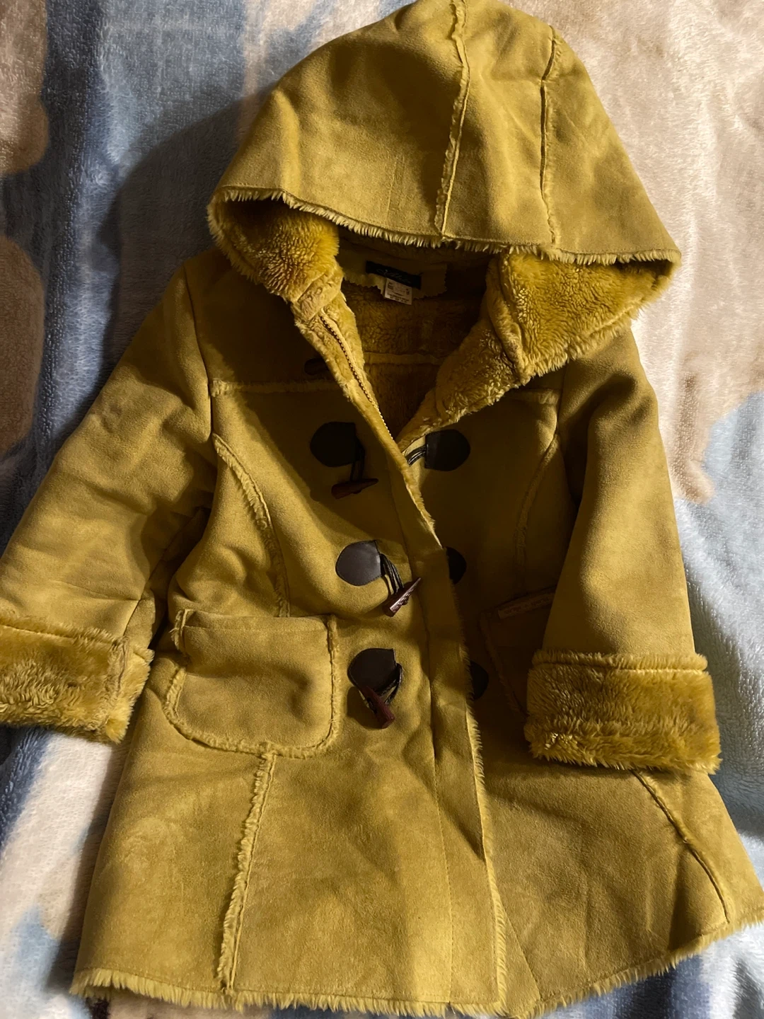 This is a tan, hooded duffle coat with a faux shearling lining. It features toggle closures and faux fur trim on the cuffs and hood. It's a stylish choice for cooler weather!