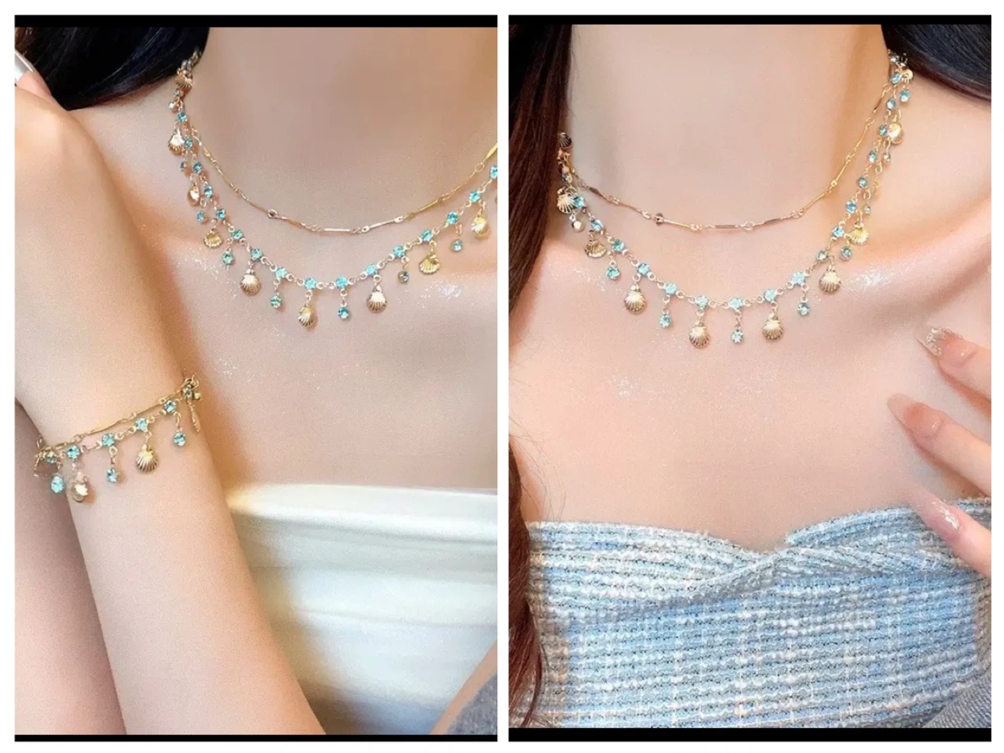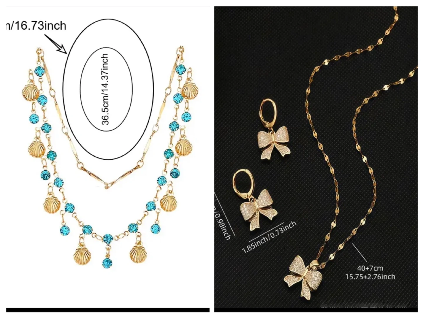 🏆This lovely set includes a layered necklace with blue gems and shell charms, plus a matching pair of earrings. The necklace chain measures 15.75+2.76 inches. The earrings are 1.85 inches long. It's a beautiful accessory set! 🏆