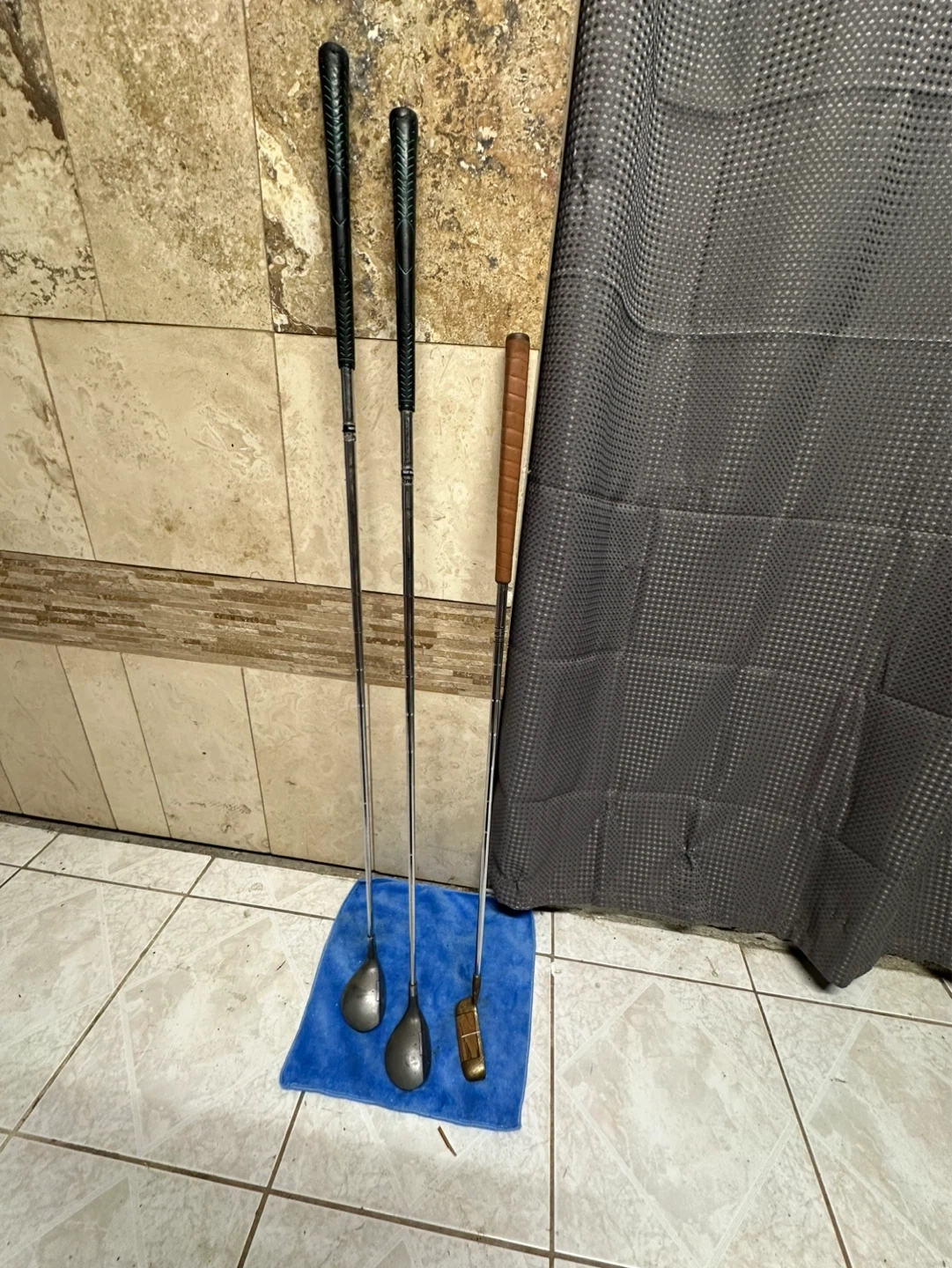 Set of three golf clubs, including a Slazenger 3 wood and a Slazenger 5 wood. Also included is a bronze-toned putter with "Walter Hagen" and "Tru-Putt" visible. Grips appear to be in good condition.